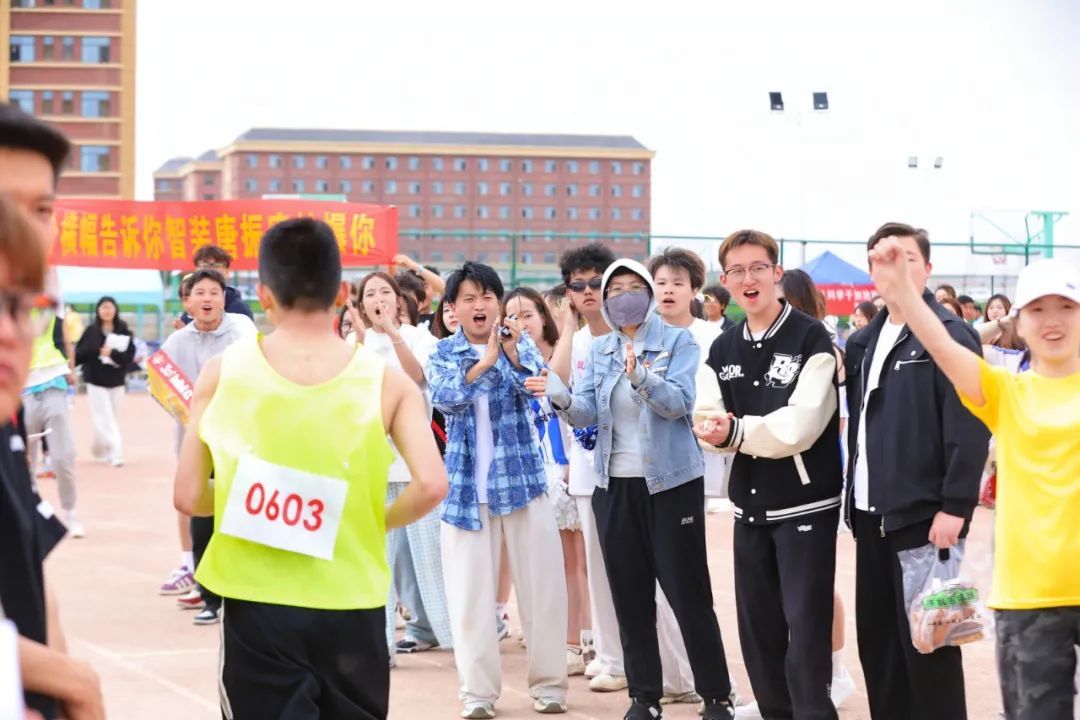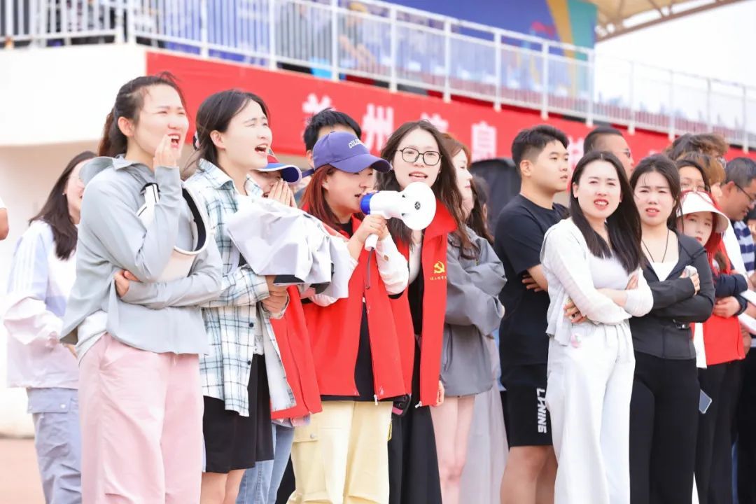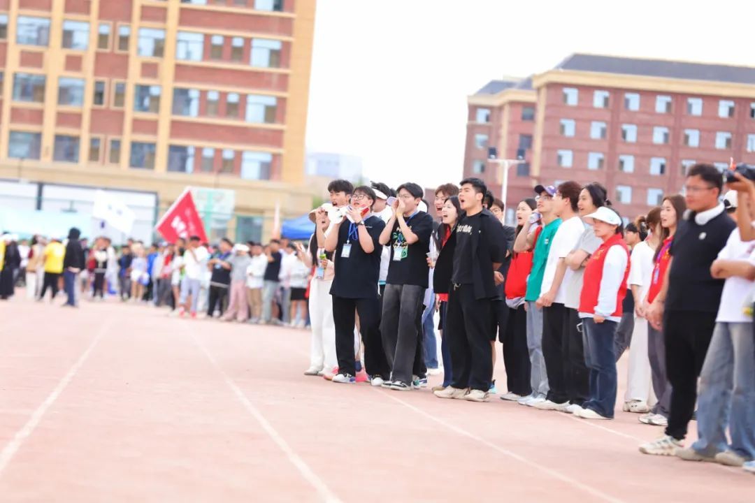 赛道之外,各位前来观赛的同学们挥舞着院旗当起了陪跑员;TA们站在赛道外呼喊助威;TA们传递着一份份成绩与加油;TA们奔波各处服务选手;TA们跟随舞动的音乐,为各自学院的运动员们加油打气,TA们也都是绿茵场上闪耀的一份子。