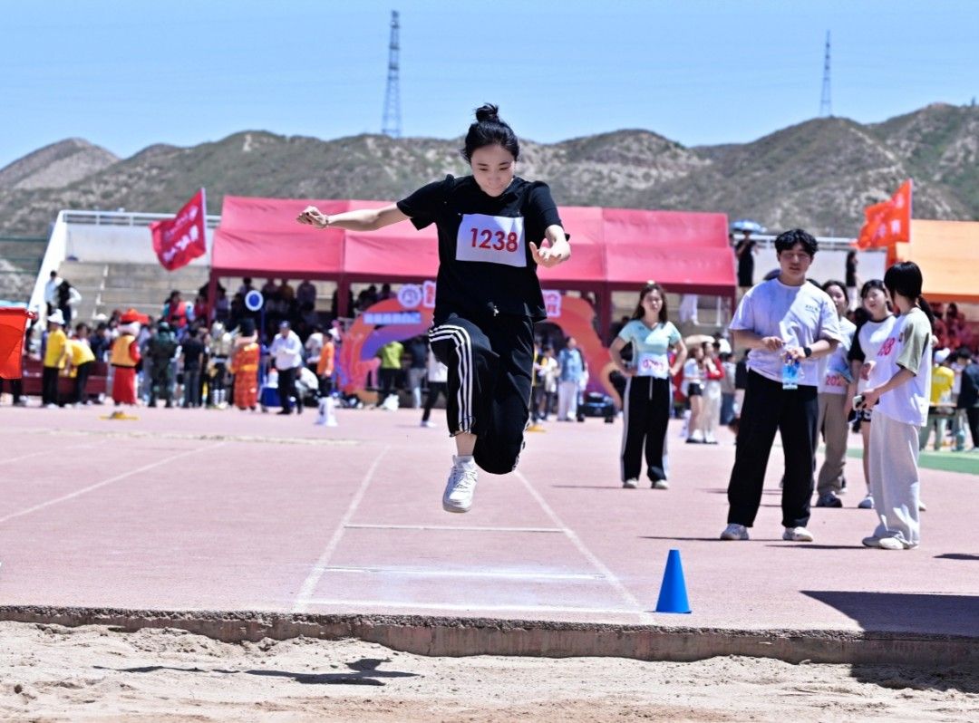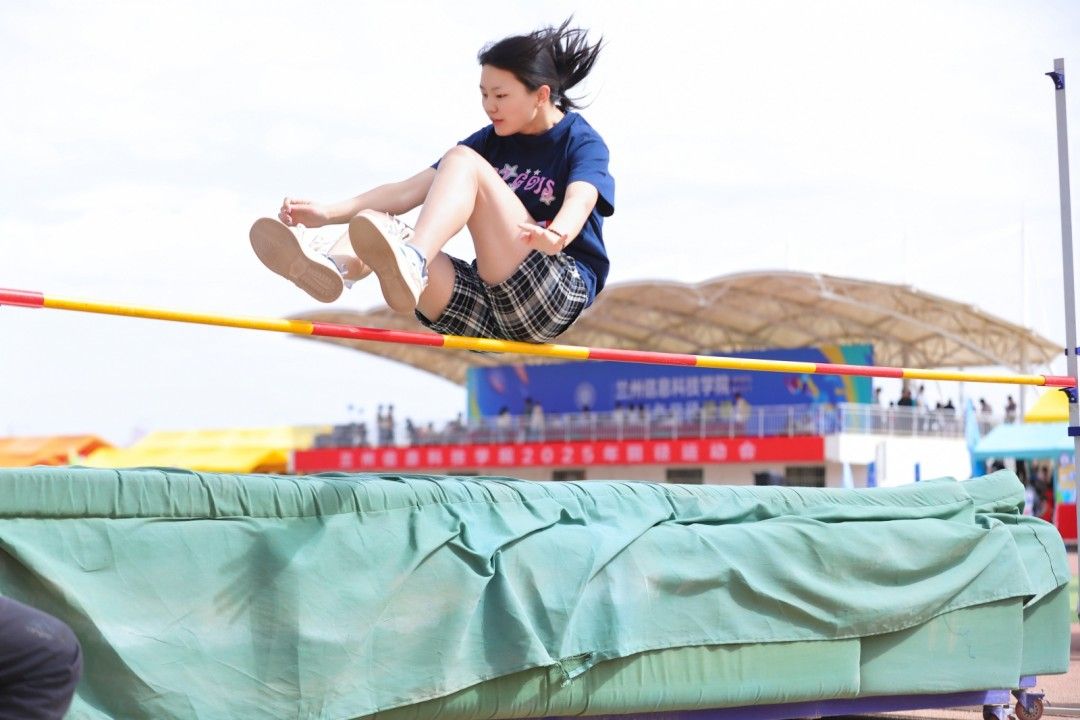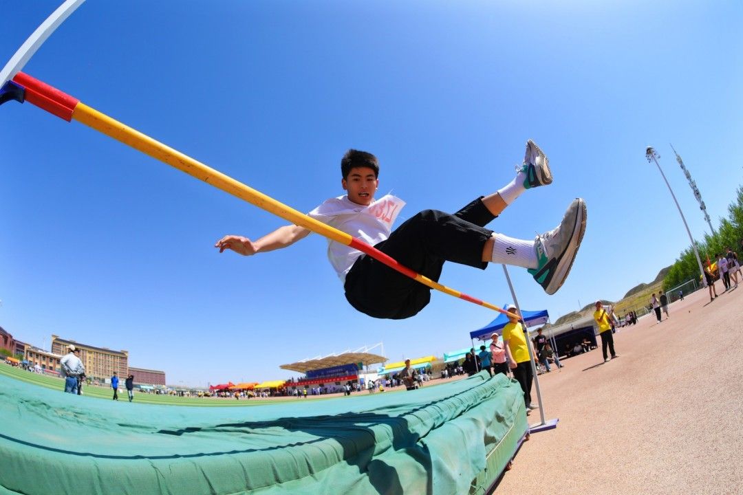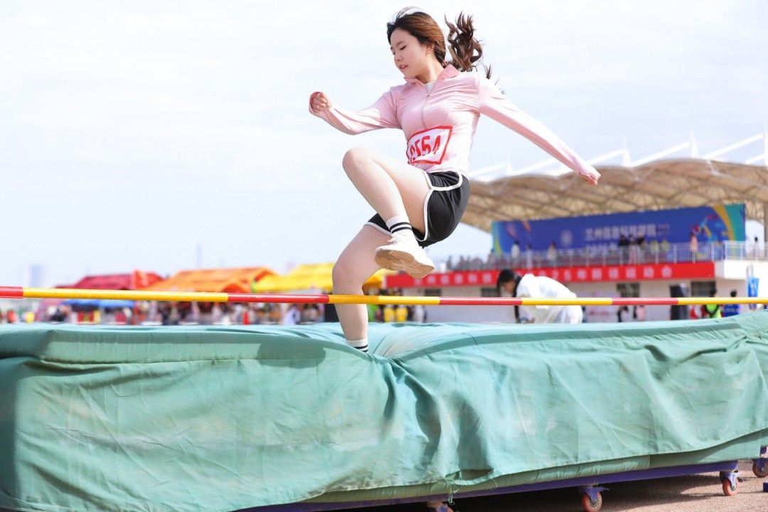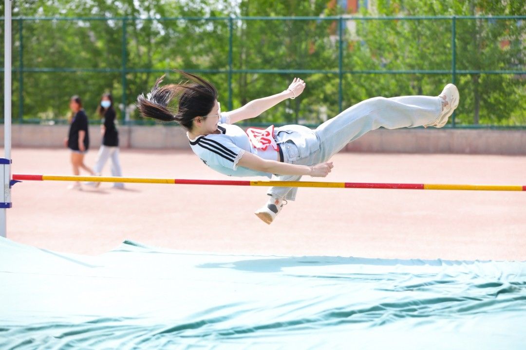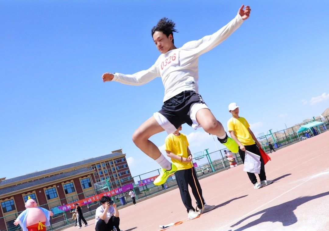 助跑、起跳、腾空、落地,加速助跑,起跳,腾空,跃下。红色的跑道,黄色的沙土,白色的起跳线,交织成了一道彩虹式的跳跃弧度。风声、喊声、喝彩声,声声入耳,那是信心、恒心、进取心写就的青春诗篇。