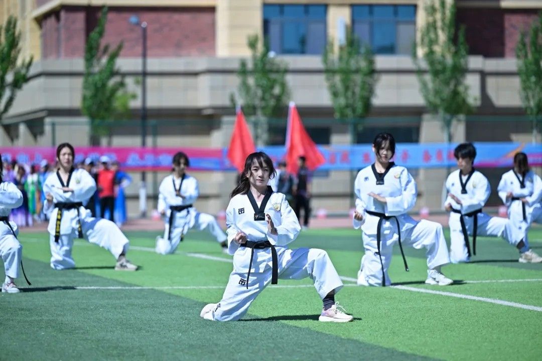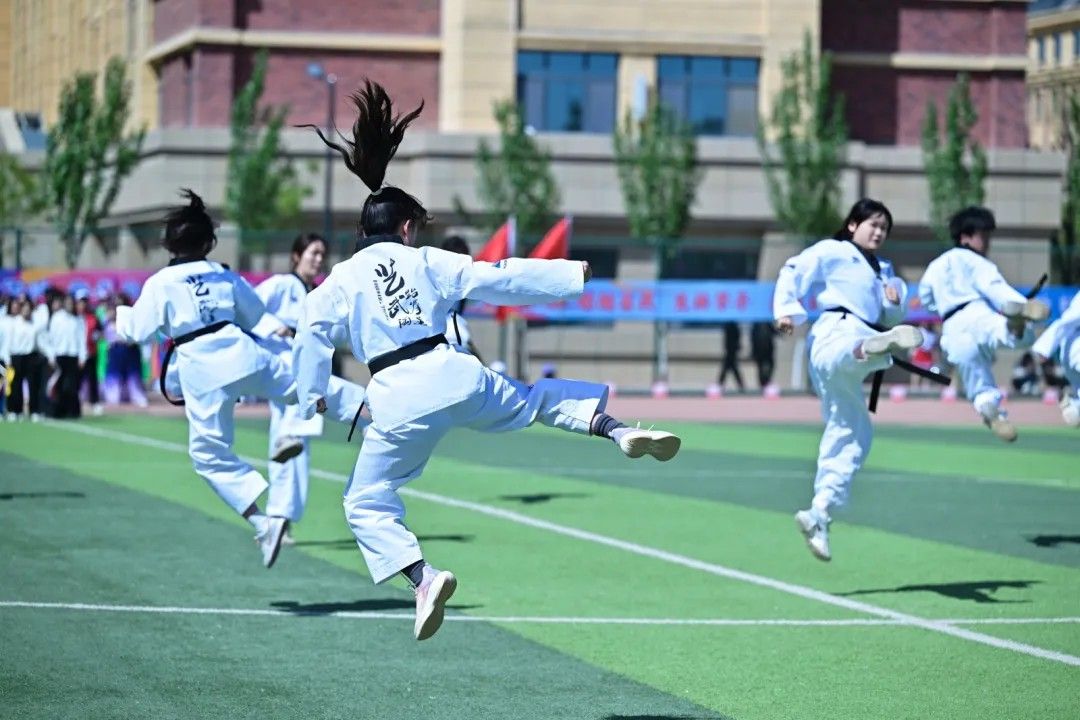 百道身影如虎跃,千钧力道破长空;白色道服翻涌似浪,黑带飞扬若闪电;呐喊声直冲云霄,踢腿声铿锵如鼓。他们以整齐划一的品势演绎力量美学,用刚猛凌厉的腿法诠释武道精神。一招一式皆是信念的凝聚,一动一静尽显团队的默契。