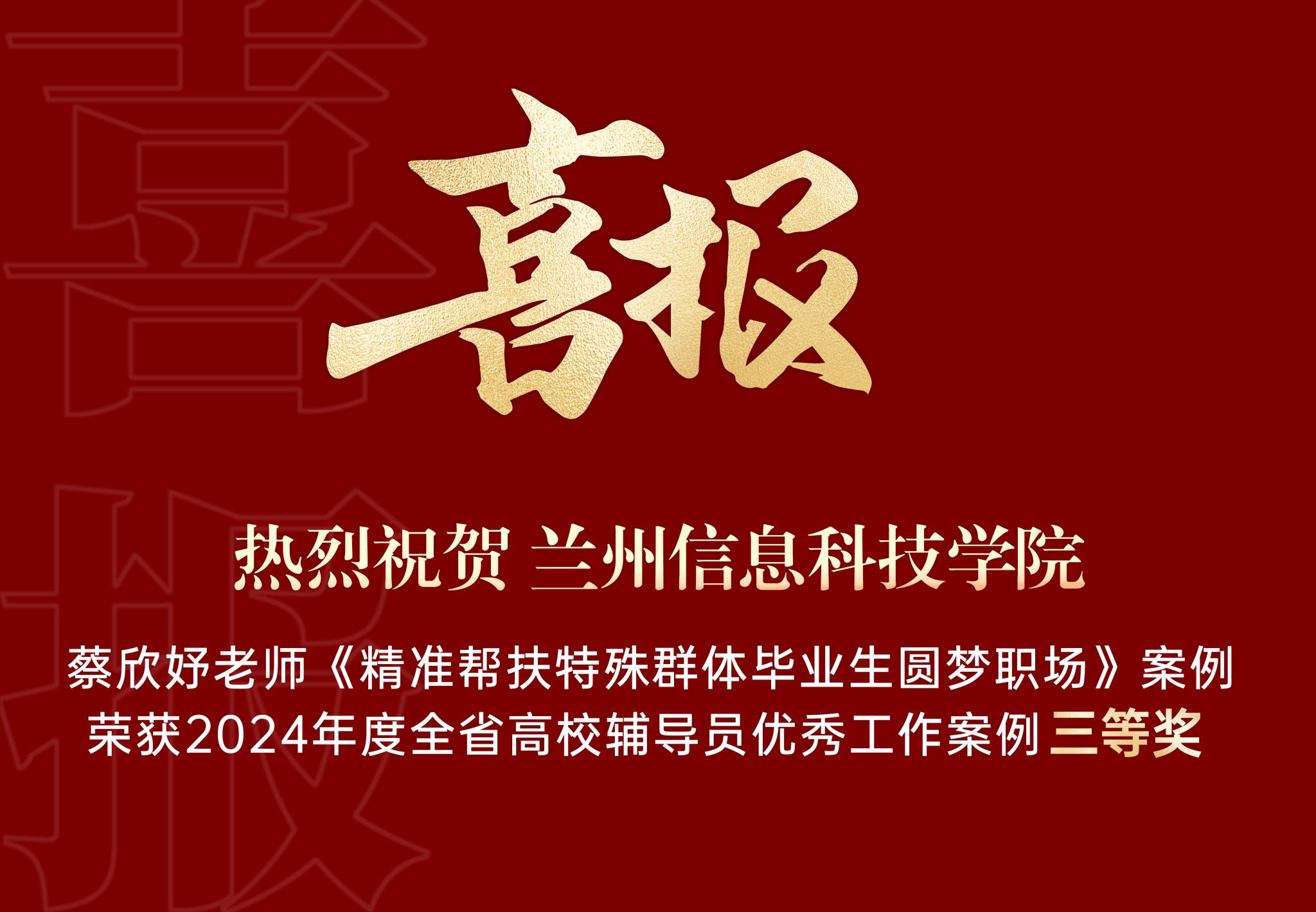 此次全省高校辅导员优秀工作案例征集评选活动由甘肃省委教育工委、省教育厅思想政治工作处统筹指导,教育部高校思想政治工作队伍培训研修中心(西北师范大学)组织开展,共收集到辅导员优秀工作案例138篇,经个人申报、单位推荐、专家评审等环节,共评选出12个一等奖、18 个二等奖、30个三等奖予以表彰。beat365在线唯一官网蔡欣妤老师撰写的《精准帮扶特殊群体毕业生圆梦职场》获得三等奖。