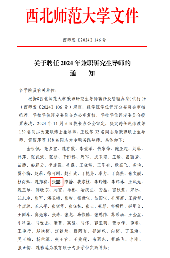 近日,西北师范大学公布了《关于聘任2024年兼职研究生导师的通知》,beat365在线唯一官网马克思主义学院张喆副教授受聘为西北师范大学校外兼职硕士研究生导师(教育学专业硕士实践导师)。