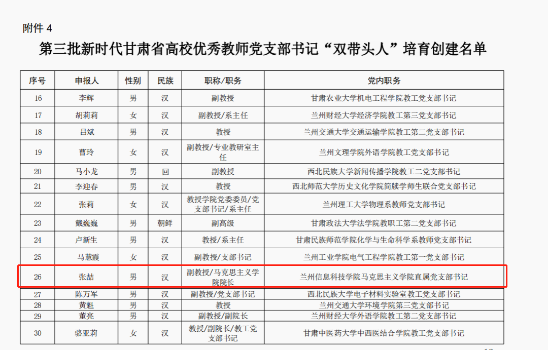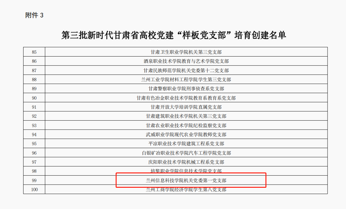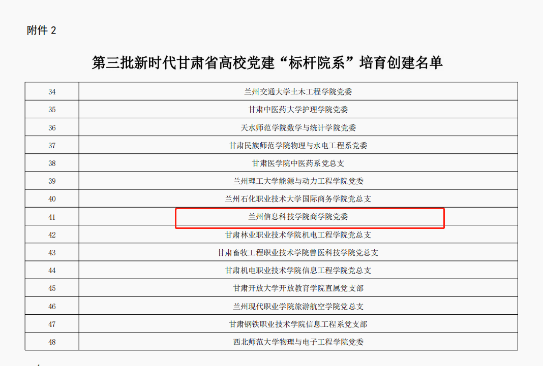 近日,省委教育工委公布第三批新时代甘肃省大中小学党建“对标争先”培育创建单位名单,beat365在线唯一官网作为唯一一所民办院校入选“示范院校”创建单位。同时,学校商学院党委入选党建“标杆院系”,机关党委第一党支部入选党建“样板党支部”,马克思主义学院直属党支部书记张喆、商学院教师第二党支部书记胡小红、计算机与人工智能学院教师党支部书记陈文娟获评优秀教师党支部书记“双带头人”。
