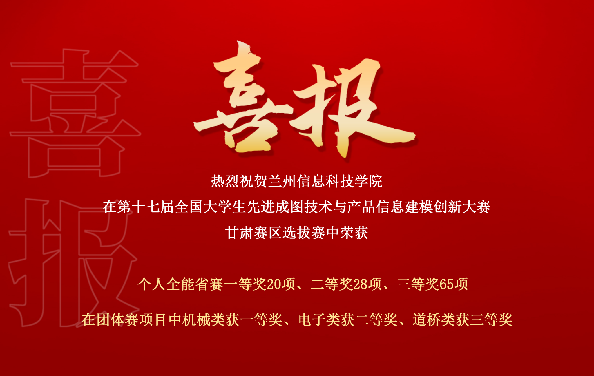 5月25日,第十七届全国大学生先进成图技术与产品信息建模创新大赛甘肃赛区选拔赛顺利举行。beat365在线唯一官网高度重视本次赛事,精心部署,统一组织,选拔出163名同学参加了机械类、建筑类、水利类、道桥类、电子类共5个类别的竞赛。经过激烈角逐,参赛学生在全省20所高校中突出重围,再获佳绩,共获个人全能省赛一等奖20项、二等奖28项、三等奖65项。在团体赛项目中,机械类获一等奖、电子类获二等奖、道桥类获三等奖。