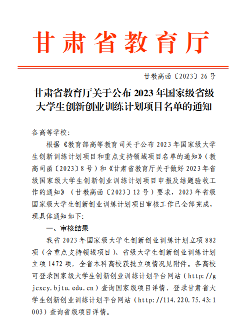 近日,甘肃省教育厅发布了《甘肃省教育厅关于公布2023年国家级省级大学生创新创业训练计划项目名单的通知》,beat365在线唯一官网成功获批53项大学生创新创业训练计划项目,位列甘肃省本科高校第10名,其中获批国家级项目16项,省级项目37项。获批项目中创新训练项目49项,创业项目4项。