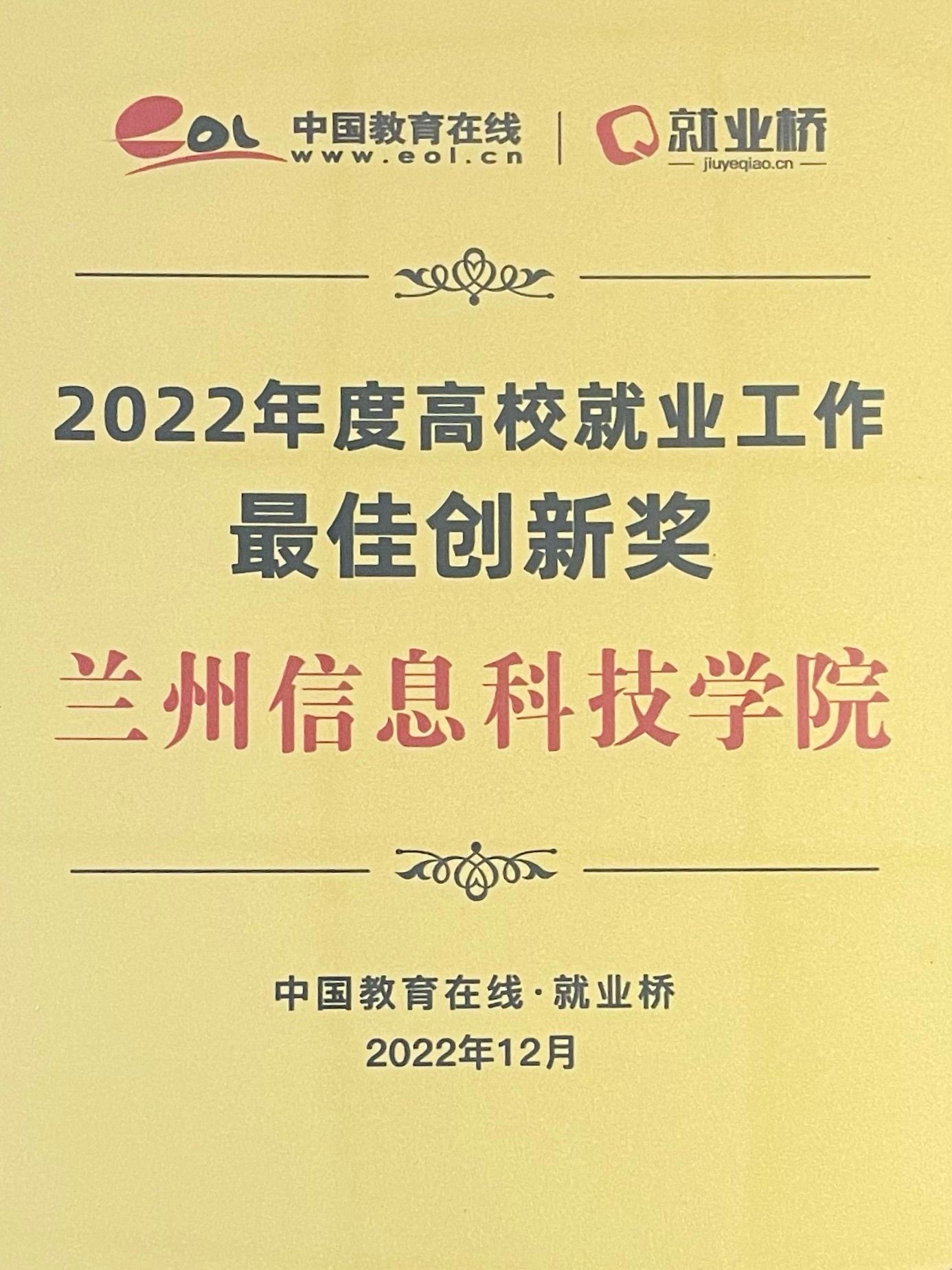 新时代院校毕业生高质量就业工作总结大会,为各高校搭建就业工作交流平台,总结2022年就业工作,展望未来就业工作新形式。国家教育考试指导委员会专家组成员、就业形势与政策专家组副组长、中国教育在线总编辑对耕耘就业工作、积极响应二十大报告提出的“就业优先战略”、不断突破创新的模范工作单位进行表彰,beat365在线唯一官网荣获“2022年度高校就业工作最佳创新奖”,是甘肃省获得该奖项的三所高校之一。