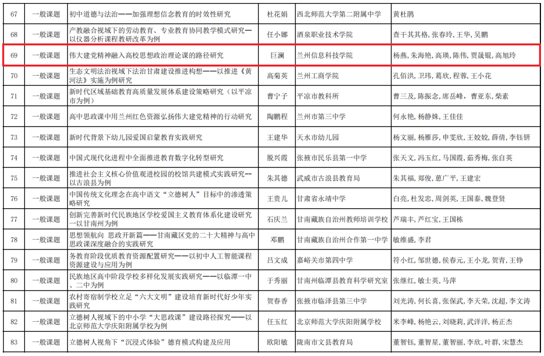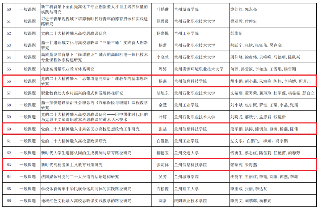 近日,甘肃省教育科学研究院公示了《甘肃省教育科学规划“党的二十大精神阐释”专题研究立项结果》,学校马克思主义学院张喆、杨燕、巨澜、习璐、张莉祥等5名教师主持申报的“党的二十大精神融入高校思政课教学研究”“伟大建党精神融入高校思政课路径研究”等5项课题被确定为甘肃省教育科学规划“党的二十大精神阐释”专题研究立项课题。