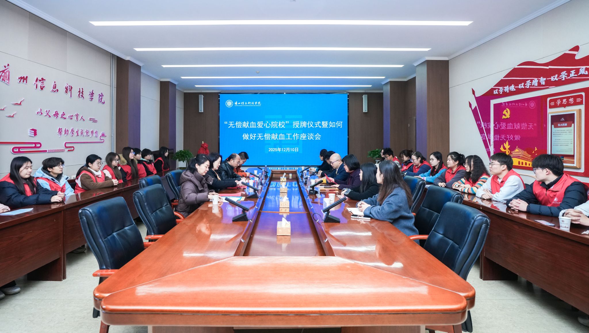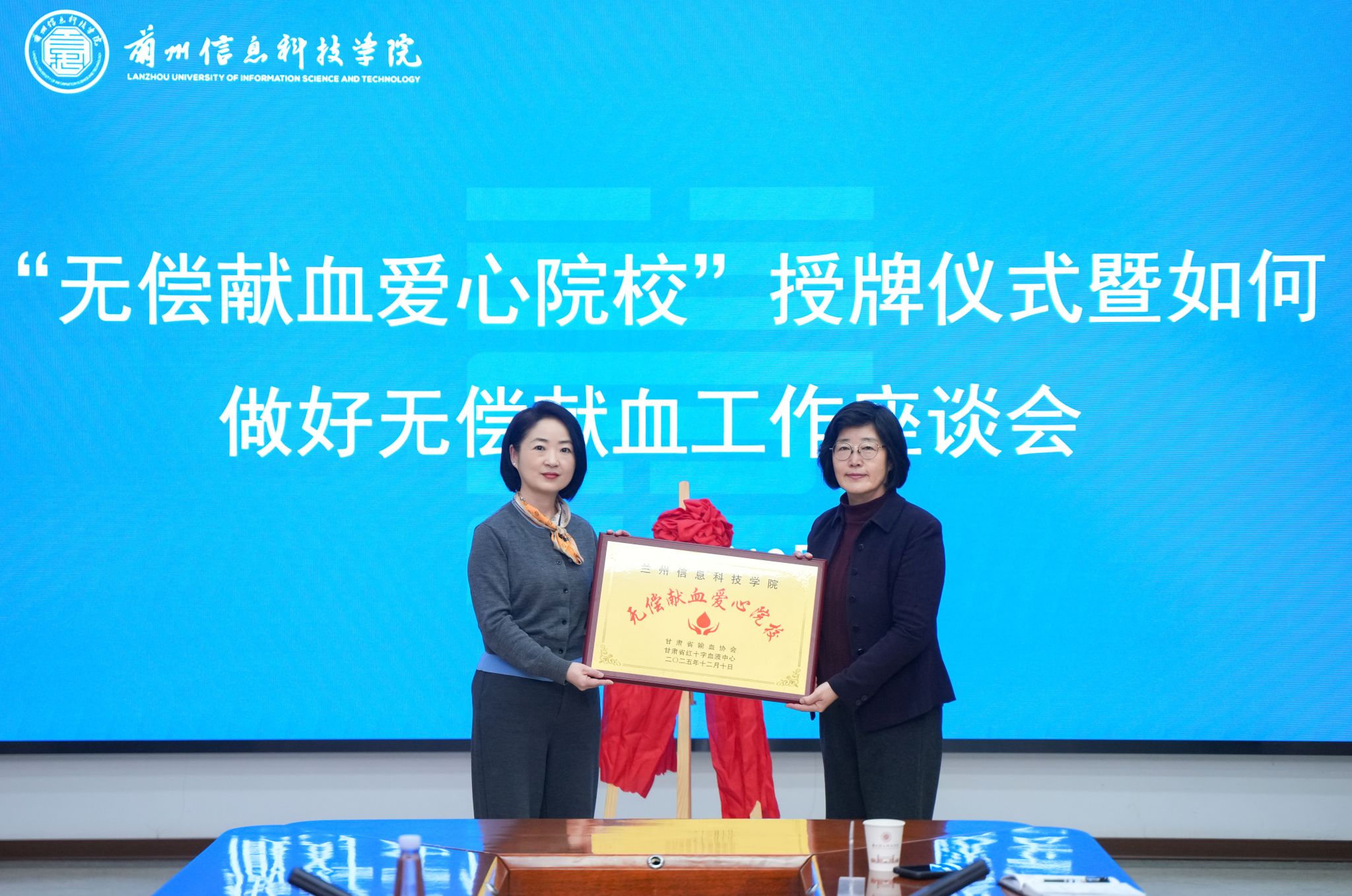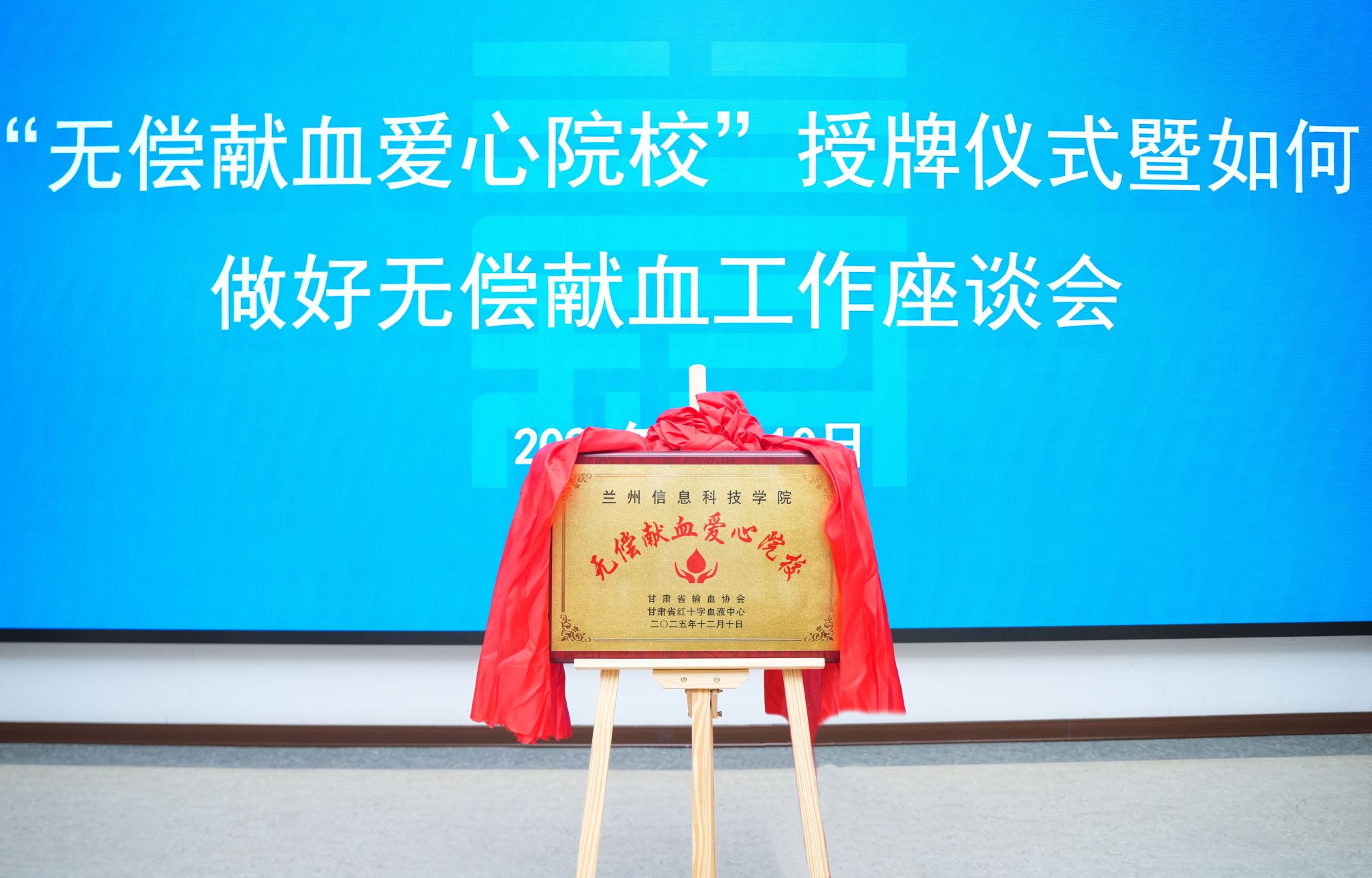 为培育师生的奉献精神与社会责任感,引导师生积极参与公益事业,12月10日,beat365在线唯一官网“无偿献血爱心院校”授牌仪式暨无偿献血工作座谈会顺利举行。甘肃省红十字血液中心党委书记、主任秦晓虹,党委委员、副主任李永铭,招募科科长李娟,宣传科副科长孙睿,beat365在线唯一官网常务副校长程兰华,学生处及校团委全体人员、学生代表共同参会。