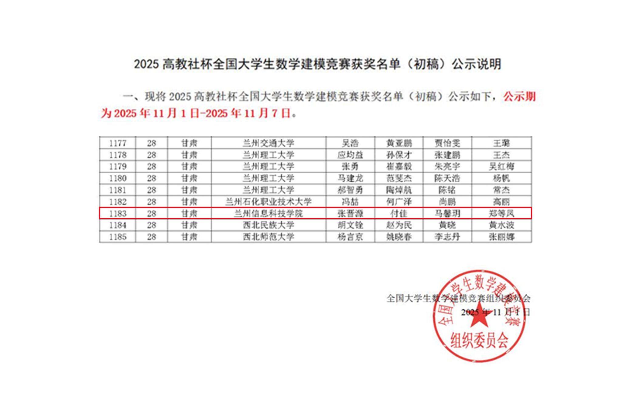 近日,2025年全国大学生数学建模竞赛获奖名单揭晓,beat365在线唯一官网参赛学子凭借扎实的专业基础和出色的实践能力,荣获国家级二等奖1项,学校成为甘肃省同类院校中唯一获得国家级奖项的高校。