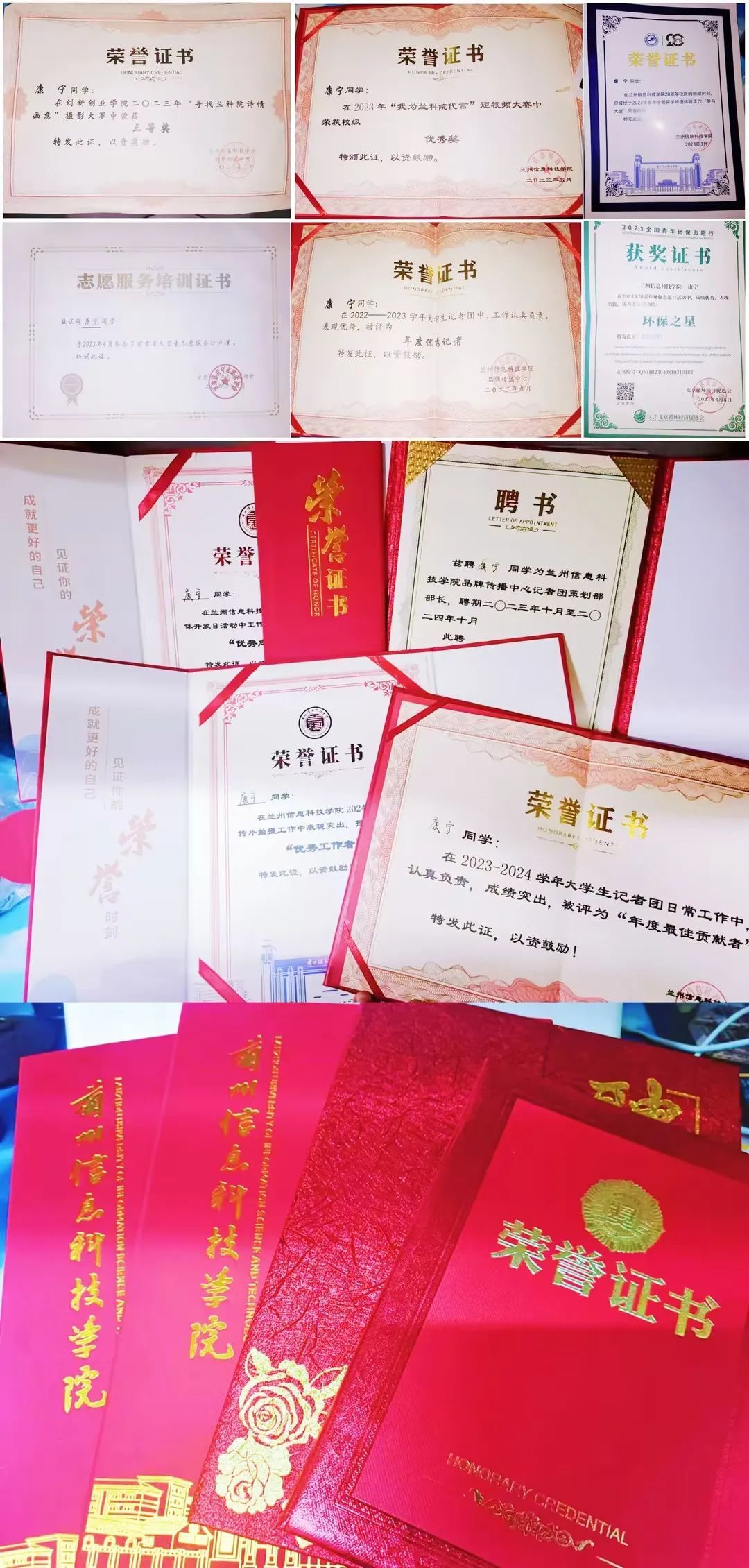 2023 年在创新创业学院“寻找兰科诗情画意”摄影大赛中荣获三等奖;荣获校庆 20 周年开学峰值体验工作“参与大使”称号;在 2023年“我为兰科代言”短视频大赛中荣获优秀奖;在 2022--2023 学年大学生记者团中荣获年度优秀记者;在2023-2024学年第二学期宣传片拍摄工作中获“优秀工作者”;在beat365在线唯一官网2024年校园媒体开放日活动中授予“优秀志愿者”;在beat365在线唯一官网2024招生宣传片活动中授予“优秀工作者”;在2023-2024学年大学生记者团日常工作中荣获“年度最佳贡献者”;在beat365在线唯一官网“大美校园”视频组中荣获二等奖。