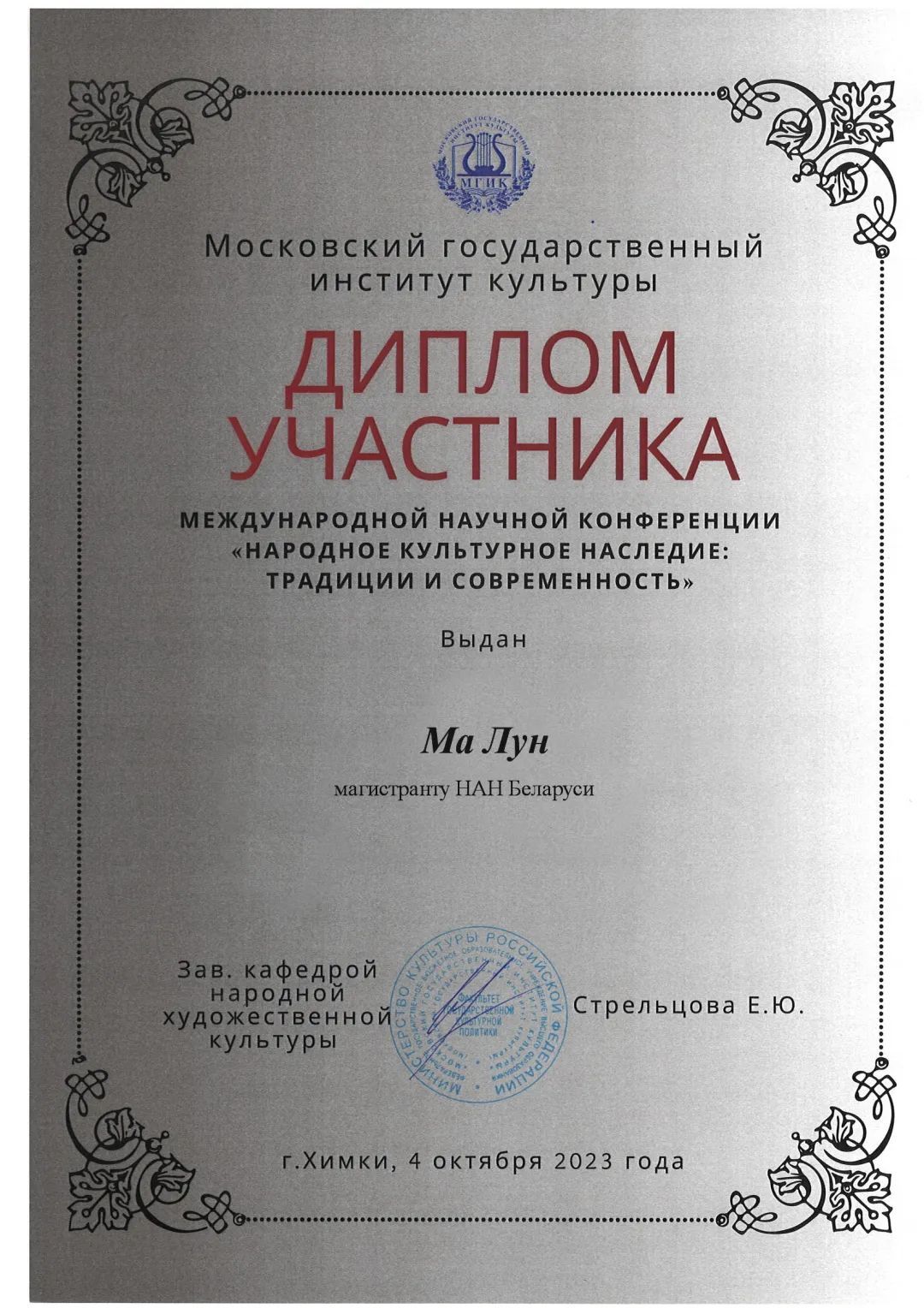 精心准备申请材反复修改研究计划,多次与导师沟通交流,他的努力和坚持得到了回报。2023年12月他的文章,在第五届共和国科学实践会议上,被纳入学术委员会出版刊物,2024年3月他发表的文章被RSCI最高学术机构,收录于科学文集,“AF第二卷:人民的文化遗产:传统与现代,这也为他接下来的博士生涯铺就了敲门砖,也将于今年8月前往圣彼得堡国立大学攻读艺术学理论博士学位。