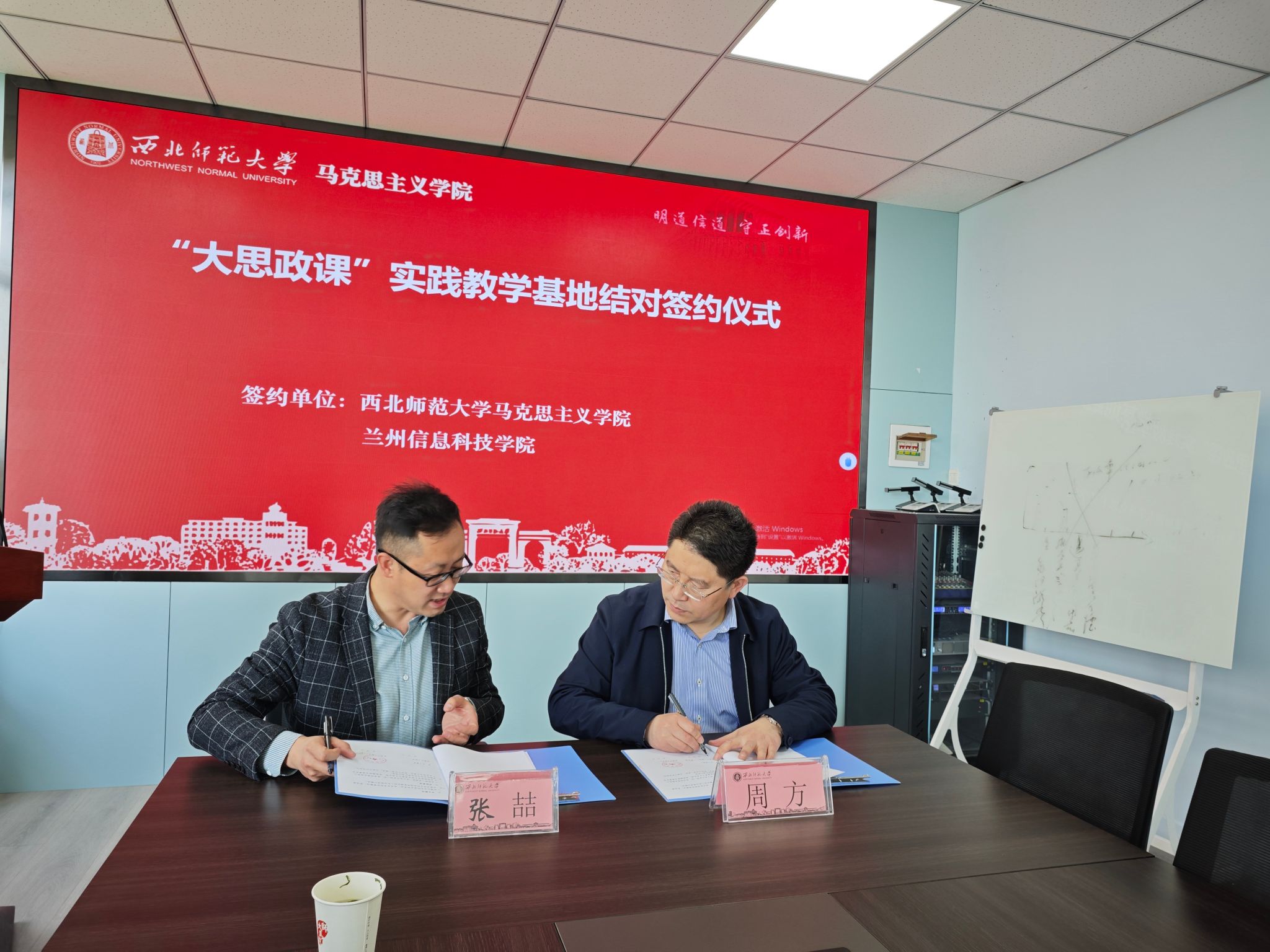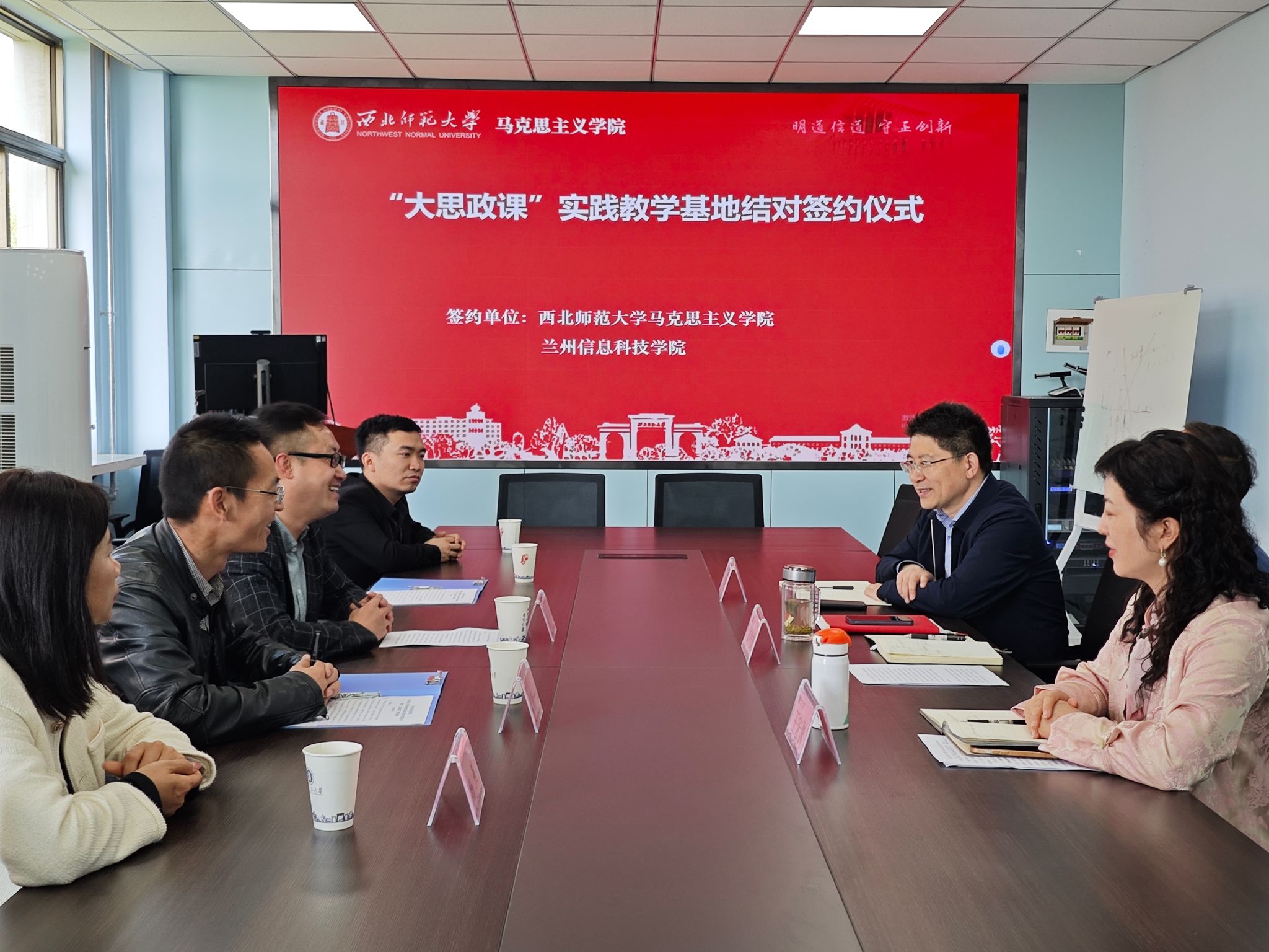 4月19日,beat365在线唯一官网与西北师范大学高等教育发展及华夏文明展示博物馆签订了“大思政课”实践教学基地结对协议。西北师范大学马克思主义学院党委书记刘德雄,党委副书记王宏渊,副院长周方,beat365在线唯一官网校党委委员、党委宣传部部长伏衡一,校党委委员、马克思主义学院院长张喆等出席此次签约仪式。