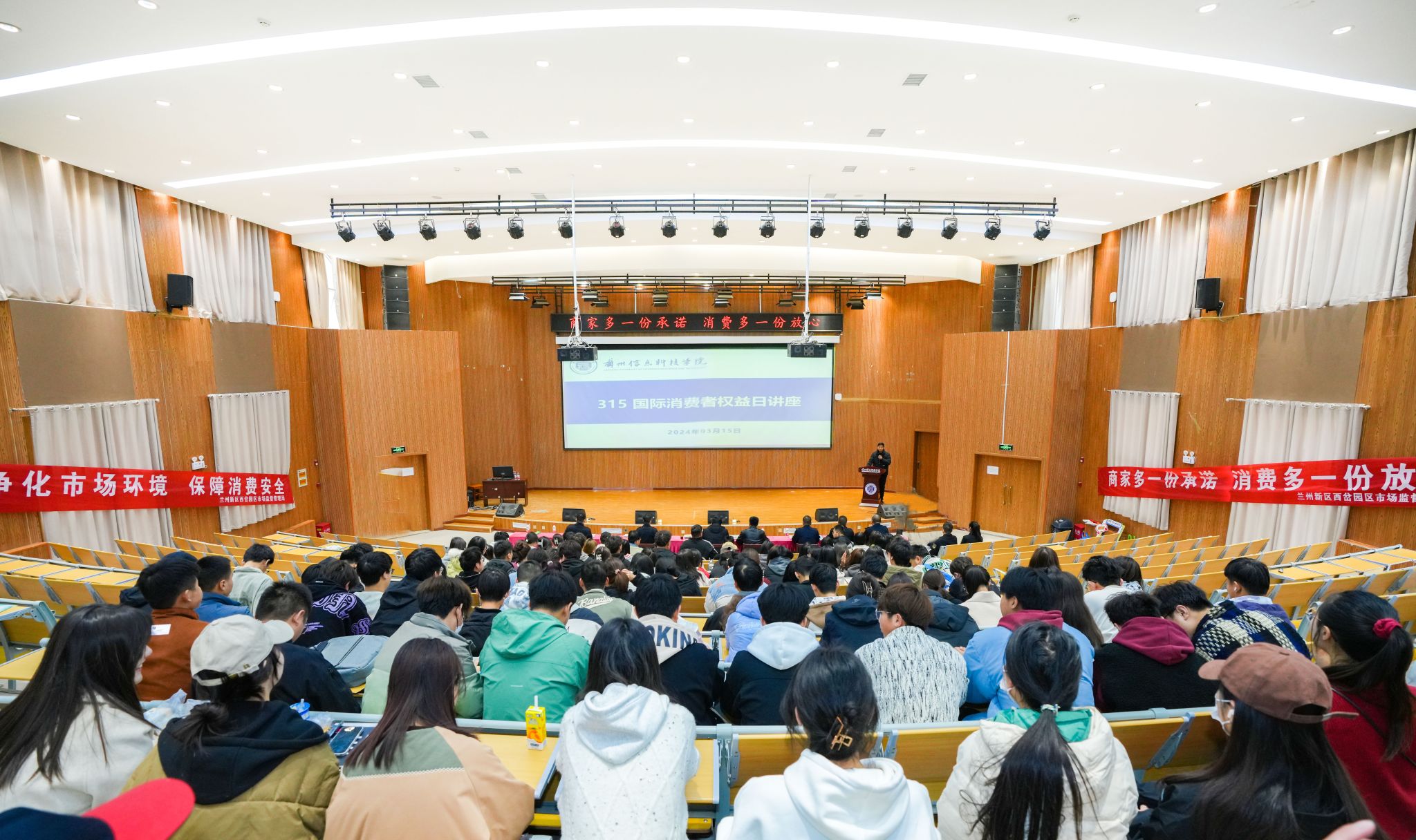 3月15日是“国际消费者权益日”,为增强广大消费者的维权意识,建立理性消费观念,提高经营者合法经营的自律度,树立诚信经营理念,beat365在线唯一官网携手兰州新区西岔园区市场监督管理局、兰州银行职教园区支行、甘肃省烟草专卖局,为学校师生及校内商业从业人员开展知识讲座,兰州新区西岔园区管委会党委委员龙贤平、兰州新区西岔园区市场监督管理局局长王克鹏莅临指导。