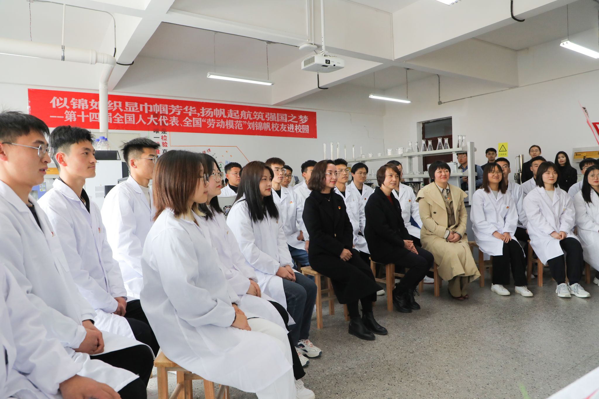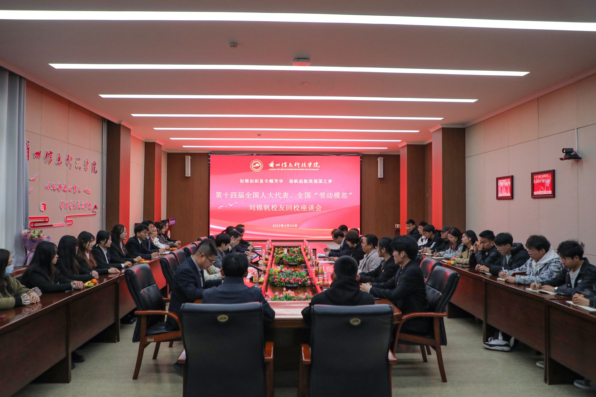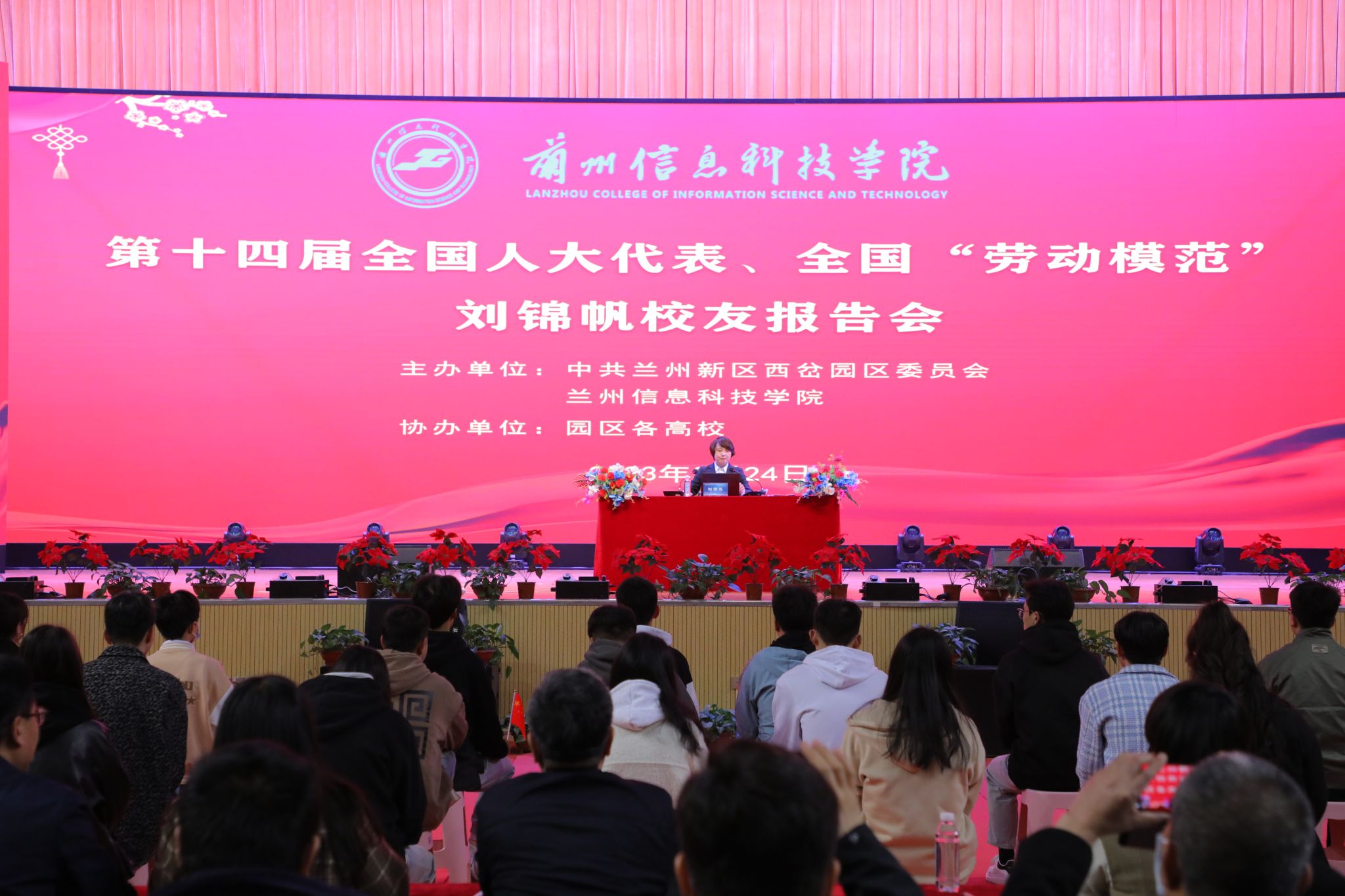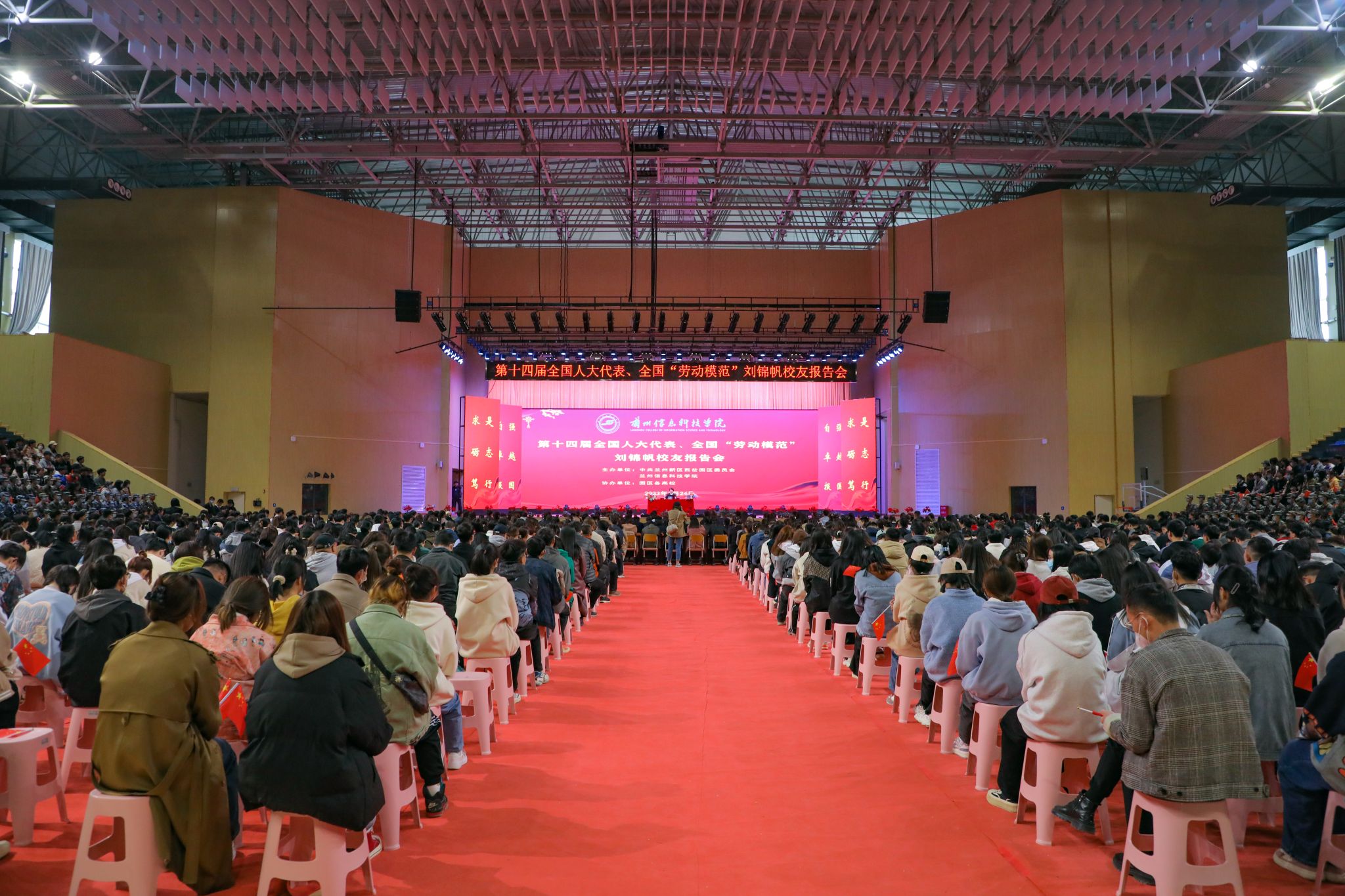 当天下午,刘锦帆同志为学校全体师生代表做第十四届全国人大一次会议精神宣讲报告,学校党委书记周怀春主持会议。庄严的国歌声中,全校千余名师生齐聚一堂,学习“两会”精神。大会上,刘锦帆结合自己参加“两会”的所见、所闻、所感,从习近平总书记重要讲话精神、大会盛况、大会主要精神,深入浅出、生动形象地还原“两会”的精彩瞬间。同时她结合工作经历,分享了自己的履职故事和感悟思考,全方位、多角度地为大家展示从一名基层职工到全国劳动模范的奋斗历程。她讲到,拼搏和奋斗是永恒的命题,新时代的伟大成就是党和人民一道拼出来、干出来、奋斗出来的,作为党和国家发展事业建设的一份子,我们更应该立足岗位,勇挑重担,用高度的责任感和敬业精神,践行劳动精神、工匠精神。她呼吁,要做有理想、敢担当、能吃苦、肯奋斗的新时代好青年,让青春在全面建设社会主义现代化国家的火热实践中绽放绚丽之花。