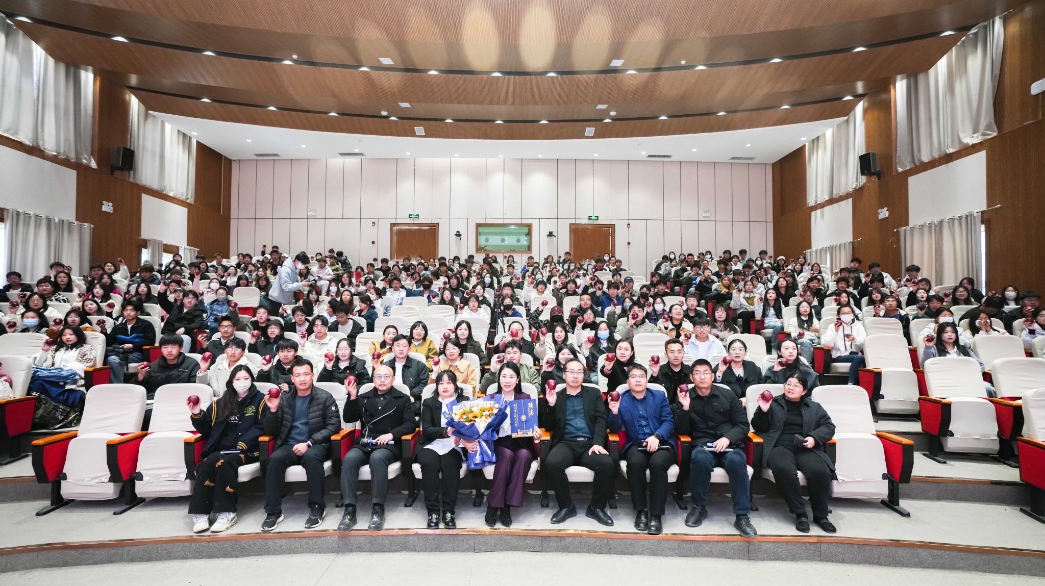 讲座尾声,董晓梅代表为在场的每位师生送上了一份特别的礼物——产自秦安县的苹果。红彤彤的苹果不仅承载着“平安丰收”的美好寓意,更寄托了她对青年学子的殷切期望,希望同学们像这苹果一样,扎根沃土、向阳生长,用劳动与智慧结出人生的硕果!