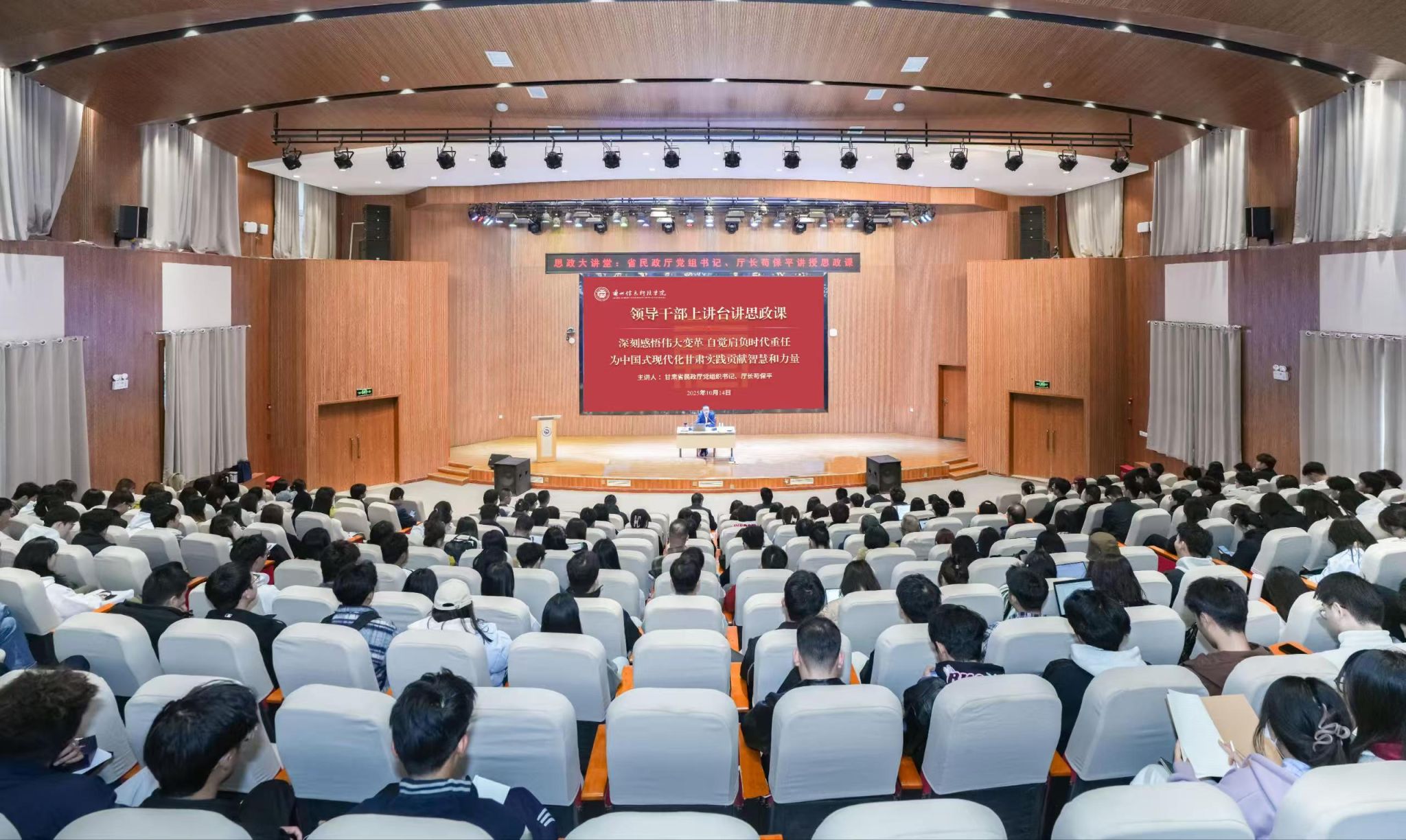 苟保平围绕“深刻感悟伟大变革 自觉肩负时代重任,为中国式现代化甘肃实践贡献智慧和力量”这一主题,结合当前的形势和任务,通过举事例、找规律、探成因,使讲思政课不停留在“是什么”而是回答“为什么”;注重揭示创新理论、实践成果、政策文件背后的思想力量和精神力量,既从宏观层面回顾了新时代的伟大变革,帮助师生深刻认识到中国式现代化的光明前景;又鼓励广大师生深刻把握中国式现代化甘肃实践的丰富内涵与战略定位,充分认识甘肃现代化建设蕴含的巨大机遇与发展潜力,在踊跃投身陇原振兴发展的火热实践中激发奋斗之志,锐意创新进取;同时结合甘肃民政工作实际,生动解读了新时代民政工作职责使命,让师生真切感受到民政工作与民生福祉、社会发展的紧密联系,对青年一代如何肩负时代重任、服务奉献社会也有了更清晰的方向。他寄语广大青年,要在努力练好人生和事业基本功中增长智慧才干、淬炼担当之能;在传承弘扬民政文化丰富内涵中厚植为民之情、践行爱民初心。努力成长为有理想、敢担当、能吃苦、肯奋斗的新时代好青年,为加快建设幸福美好新甘肃、不断开创富民兴陇新局面,奋力谱写中国式现代化甘肃篇章贡献自己的智慧和力量!