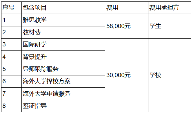 4.费用标准:88,000元/生,学校资助30,000元,学生自费58,000元,具体明细如下: