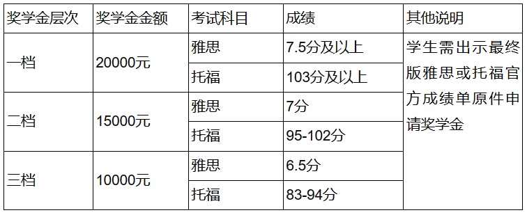 凡参加国际英才班学生,根据最终取得分数的不同留学考试成绩,可获得不同层次的奖学金。具体明细如下: