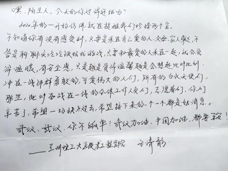 新型冠状病毒感染的肺炎疫情,牵动着我们每个人的心。有一份寄托,夹杂着最诚挚的祝福和敬意。有一种爱,是从远方牵挂担心。隔离病毒但未曾隔离爱,此时此刻,我们关注疫情,共战疫情,“精感石没羽,岂云惮险艰。”我校学子用一笔一划,写下祝福与期盼。一撇一捺,记录鼓励与感动。送给抗疫第一线夜以继日奋战的医护人员,送给那些无私奉献的可爱人儿,为武汉加油!为湖北加油!为中国加油!