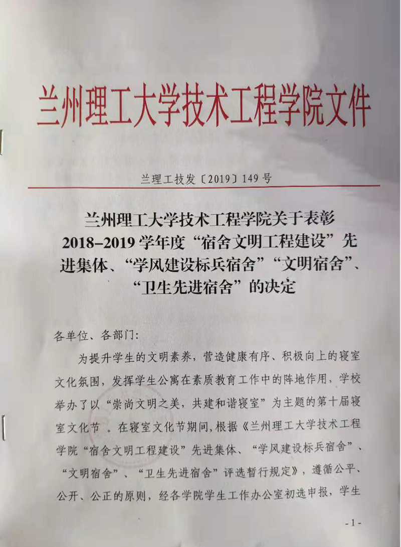 兰州理工大学技术工程学院关于表彰2018—2019学年度“宿舍文明工程建设”先进集体、“学风建设标兵宿舍”、“文明宿舍”、“卫生先进宿舍”的决定