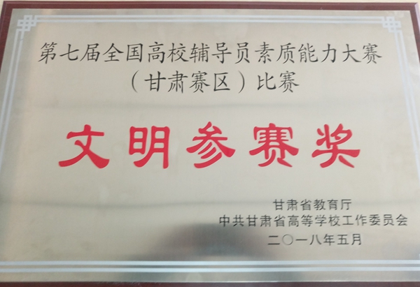 2018年5月5日,为期三天的第七届全国高校辅导员素质能力大赛(甘肃赛区)比赛在兰州理工大学落下了帷幕,本次大赛共有来自省内47所高校的69名辅导员参加,我院机电工程系张宁老师代表学院参加了本次比赛。学生处组织全体辅导员共同观摩了比赛全过程,学院最终被大赛组委会评为“文明参赛奖”。