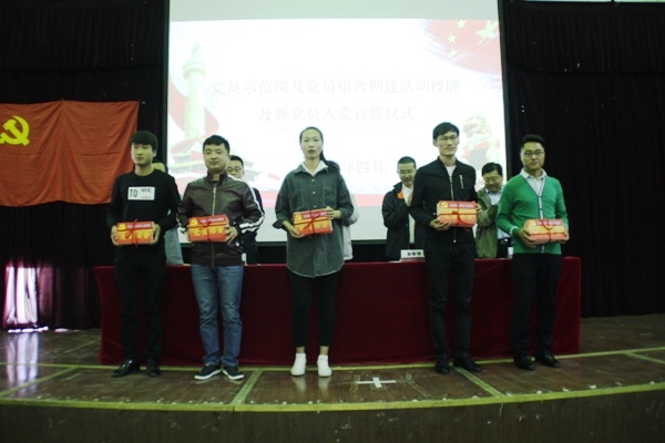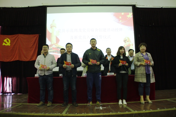会上169名新党员在领誓人的带领下面向党旗庄严宣誓。副院长谢黎明宣读了《学院党委关于在全体党员中开展党员示范岗和党员宿舍创建活动方案》,随后为教师党员代表和学生党员代表授予党员示范岗和党员宿舍标牌。授予标牌的教师党员代表和学生党员代表分别结合自身工作、学习情况进行了发言。