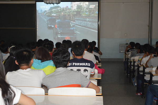 9:30,全体团委学生干部在砺志楼C区201教室集体观看此次阅兵盛典转播。庆典开始时,嘹亮的《义勇军进行曲》响彻了整个天安门广场,鲜艳的五星红旗像一束火焰在天幕上燃烧。习近平总书记肃立在敞篷车的正中央驶过金水桥,向海陆空三军问好。