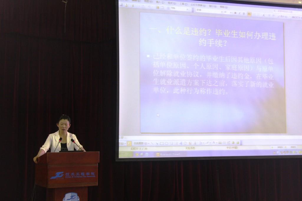 为帮助2011届毕业生顺利就业,招就处和学生处于5月19日和20日下午,在砺志楼E区二楼报告厅联合举办2011届毕业生就业流程宣讲会,宣讲会由学院招就处就业办副主任杨朝霞老师主讲,全体毕业生参会。