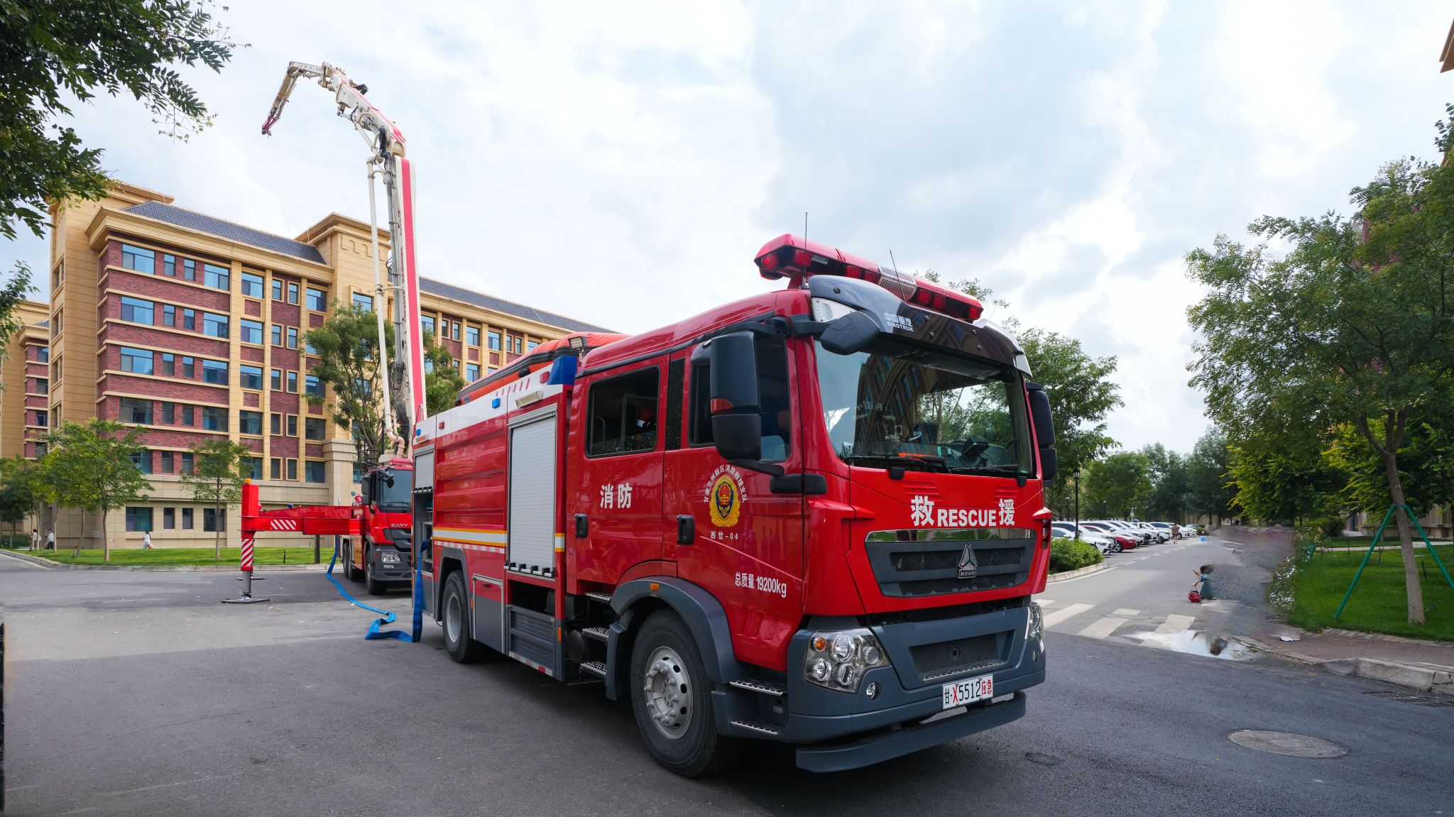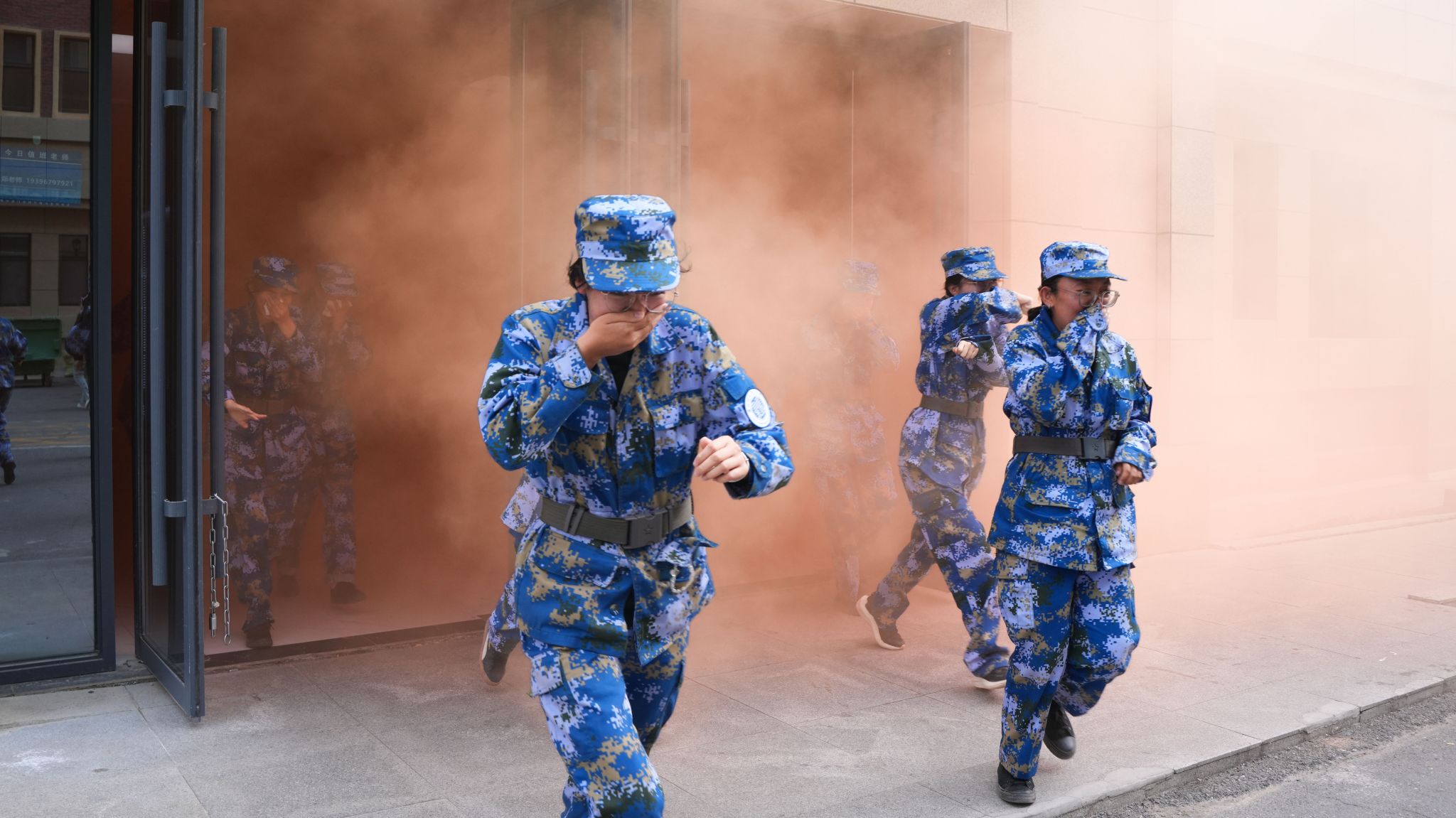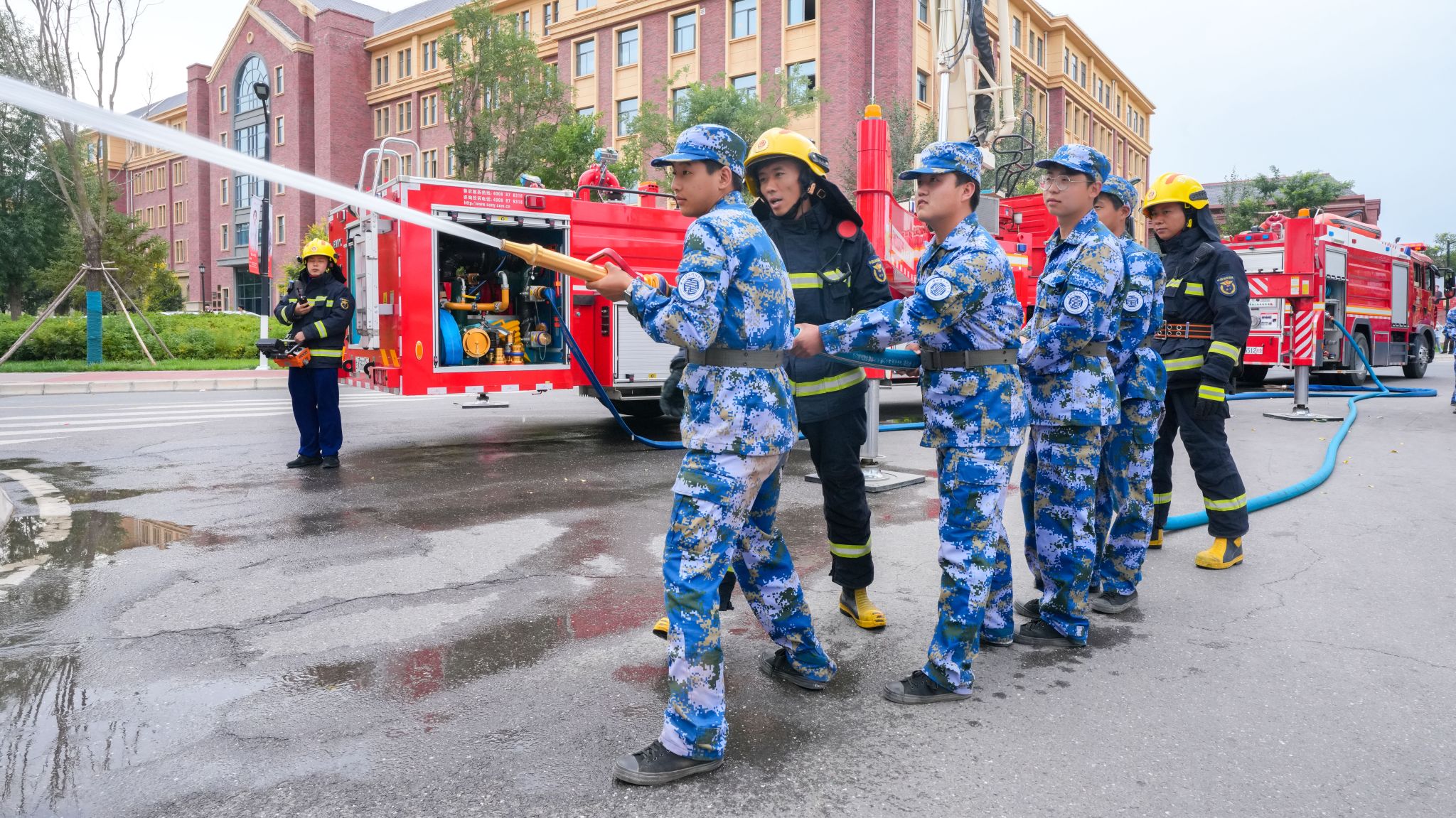 应急逃生疏散及灭火演练环节,学校联合兰州新区消防救援支队共同组织开展了一场兼具实用性与实战性的应急逃生疏散及灭火演练。消防救援官兵通过现场讲解、演示方式普及地震避险要点与火灾逃生注意事项。随着警报声响起,模拟地震及火灾场景正式开启。听到警报后,同学们迅速反应,按照避险方法,立即捂住口鼻、弯腰低姿,沿着预设疏散标识快速有序地向室外安全集结点撤离。整个疏散过程中,各楼层引导员全程值守,及时疏导人流,全体参与学生安全抵达指定区域,疏散效率与秩序得到充分保障。疏散环节结束后,演练随即进入灭火实操阶段。消防员耐心讲解了水枪的握持姿势、水流调节技巧及灭火瞄准要点,新生们分组上前体验,在实践中掌握了消防器材的使用方法。