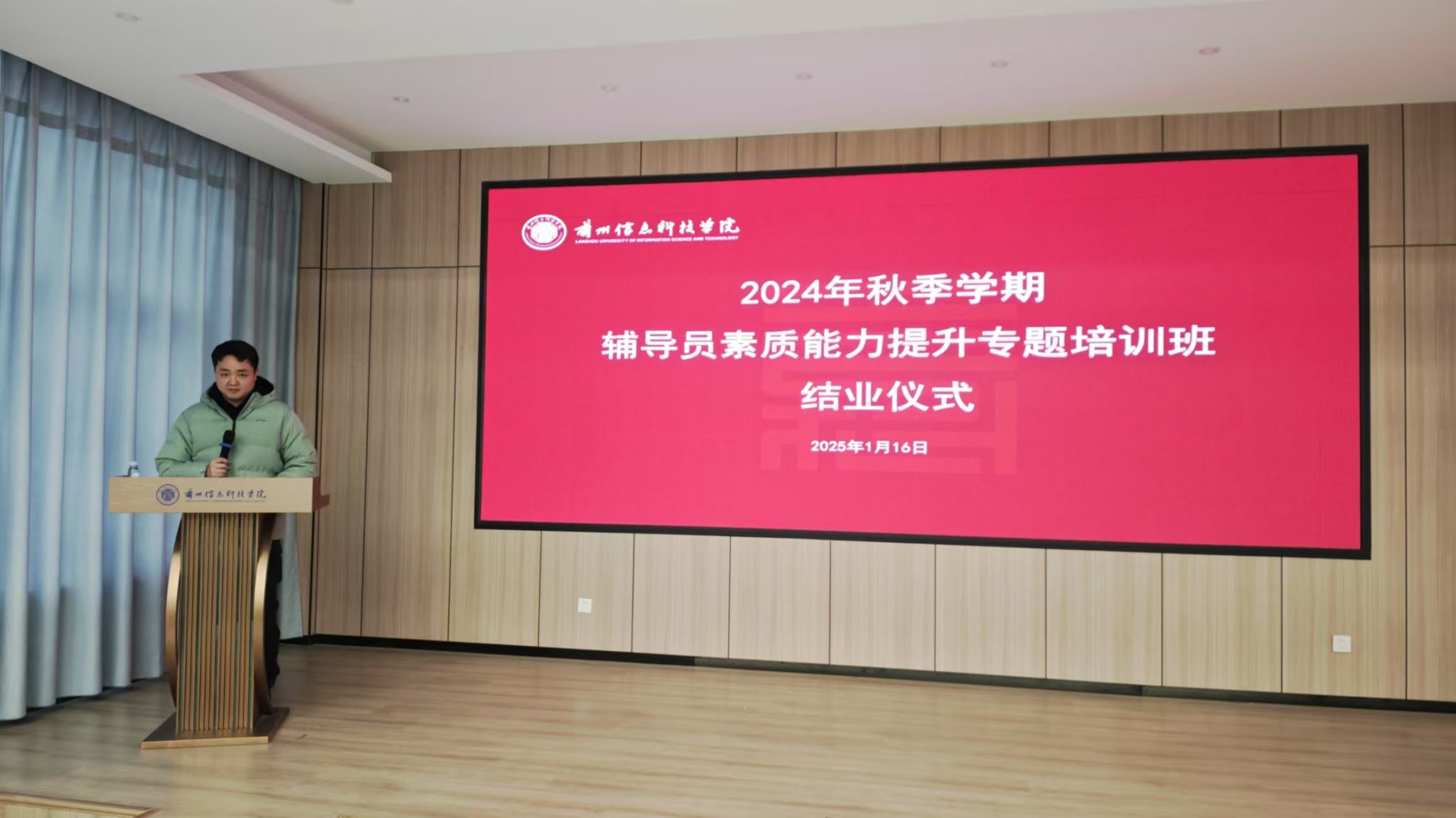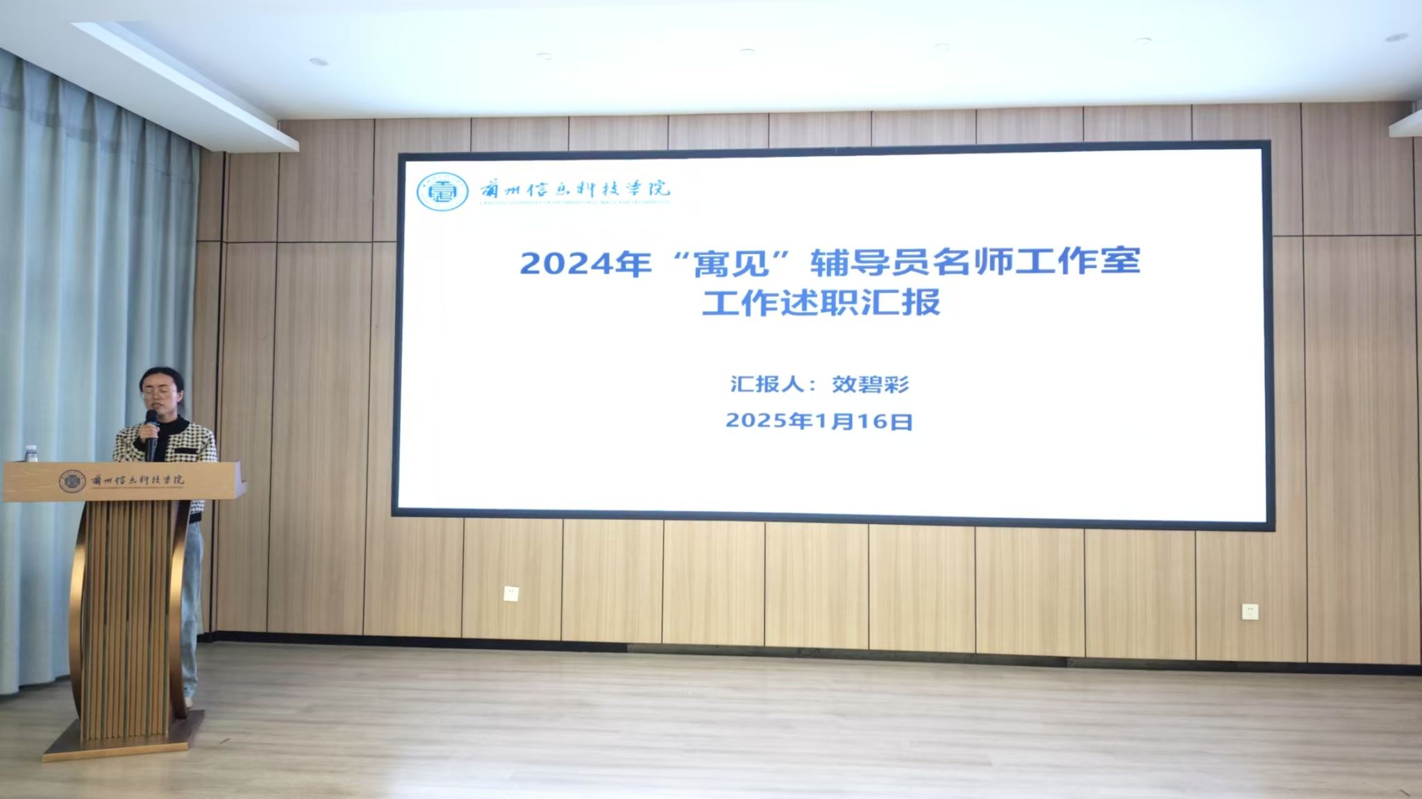 1月16日下午举行结业仪式,五个小组分别汇报了学习心得、工作反思和下一步计划。首批校级辅导员名师工作室主持人李娟娟、刘彩文、效碧彩分别代表“追光致远”“职业赢未来”“寓见”辅导员名师工作室做2024年工作汇报。