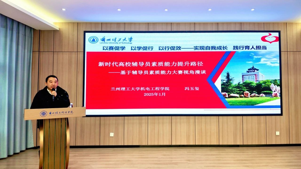 冯玉玺做了题为《新时代高校辅导员素质能力提升路径-基于辅导员素质能力大赛视角漫谈》主题报告。他结合自己7年辅导员工作经验和参加省级辅导员素质能力大赛经验,分享了辅导员职业能力大赛的备战进阶、辅导员素质能力提升的合力之维以及兰州理工大学的工作案例三方面内容,既有理论高度又切合实际的学生工作理念和经验。