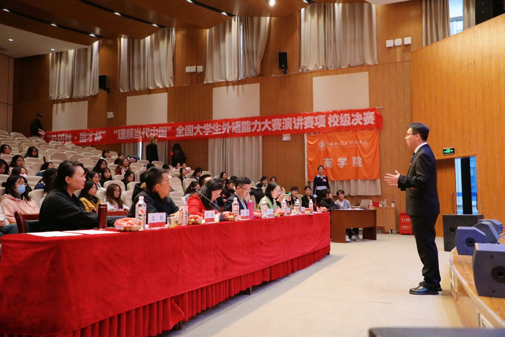 10月20日,2024“外研社·国才杯”“理解当代中国”外语能力大赛beat365在线唯一官网演讲校赛圆满落幕。此次校赛中,兰州工业学院外国语学院夏增亮副院长、兰州财经大学许菁教授为特邀评委,beat365在线唯一官网英语系高级职称教师担任评委组成员,商学院英语专业学生现场观摩学习。经过全校范围内初赛选拔,共有20位参赛选手进入校级决赛阶段。