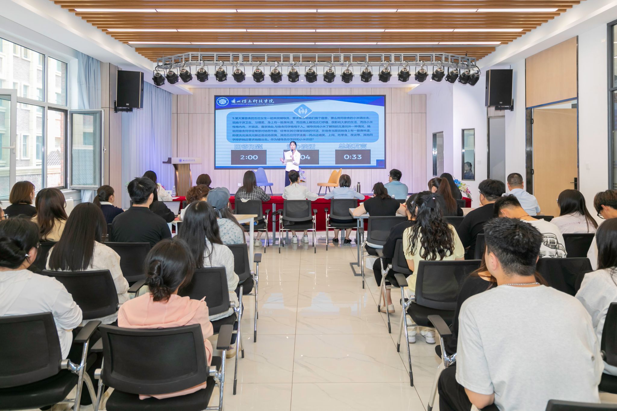 决赛邀请兰州理工大学土木工程学院党委书记张艳,兰州大学核科学与技术学院团委书记、第十届全国高校辅导员素质能力大赛甘肃省选拔赛特等奖获得者刘凯璇等老师担任评委,党委委员、校长助理朱明敏出席,全体辅导员(含书院辅导员)现场观摩大赛。