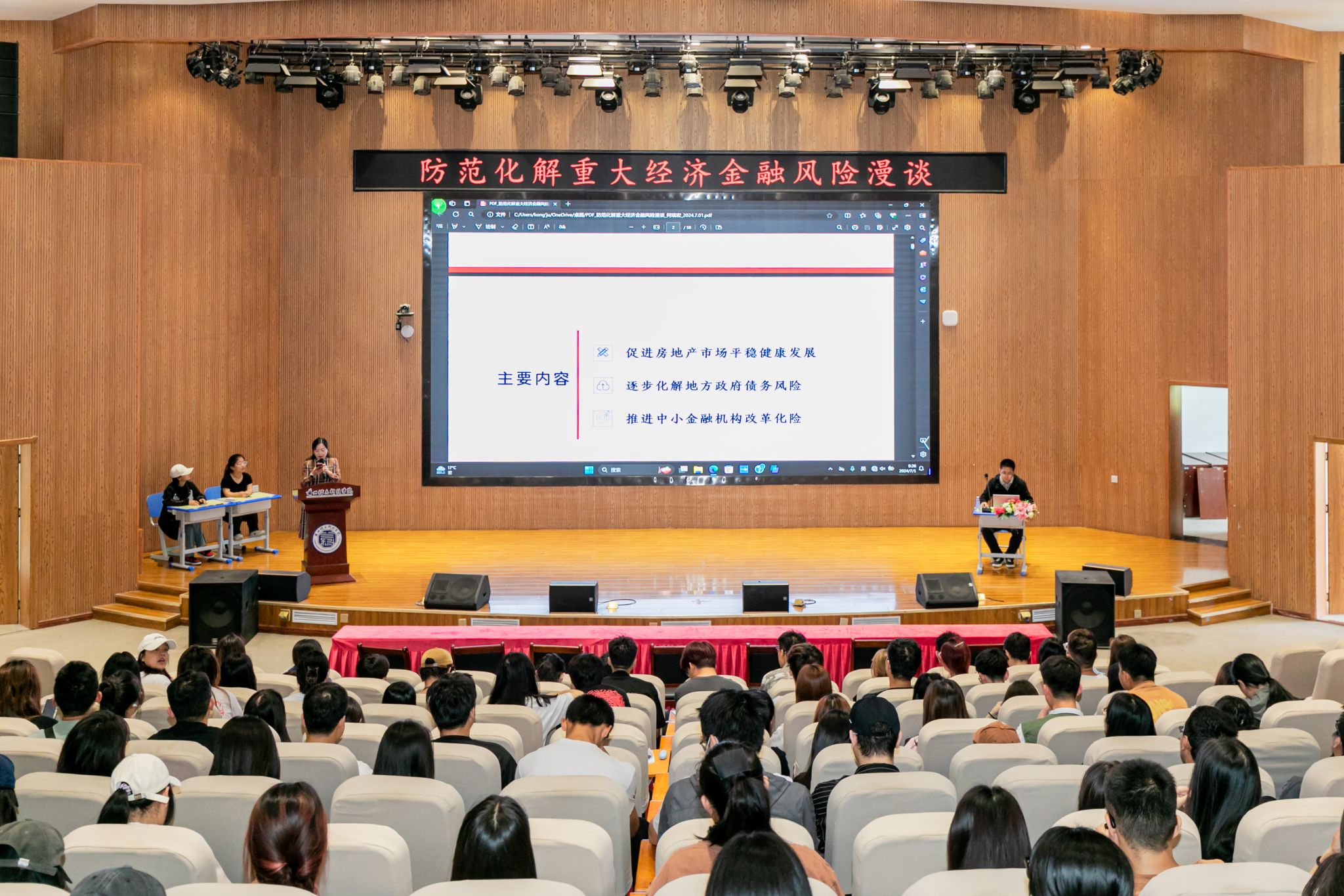 为进一步营造良好的学术氛围,帮助学生了解专业前沿,营造良好的学术氛围,7月1日,学校在2号报告厅举办《防范化解重大经济金融风险漫谈》专题讲座,西北师范大学经济学院教授何瑞宏应邀担任主讲,全体师生聆听了本场讲座。