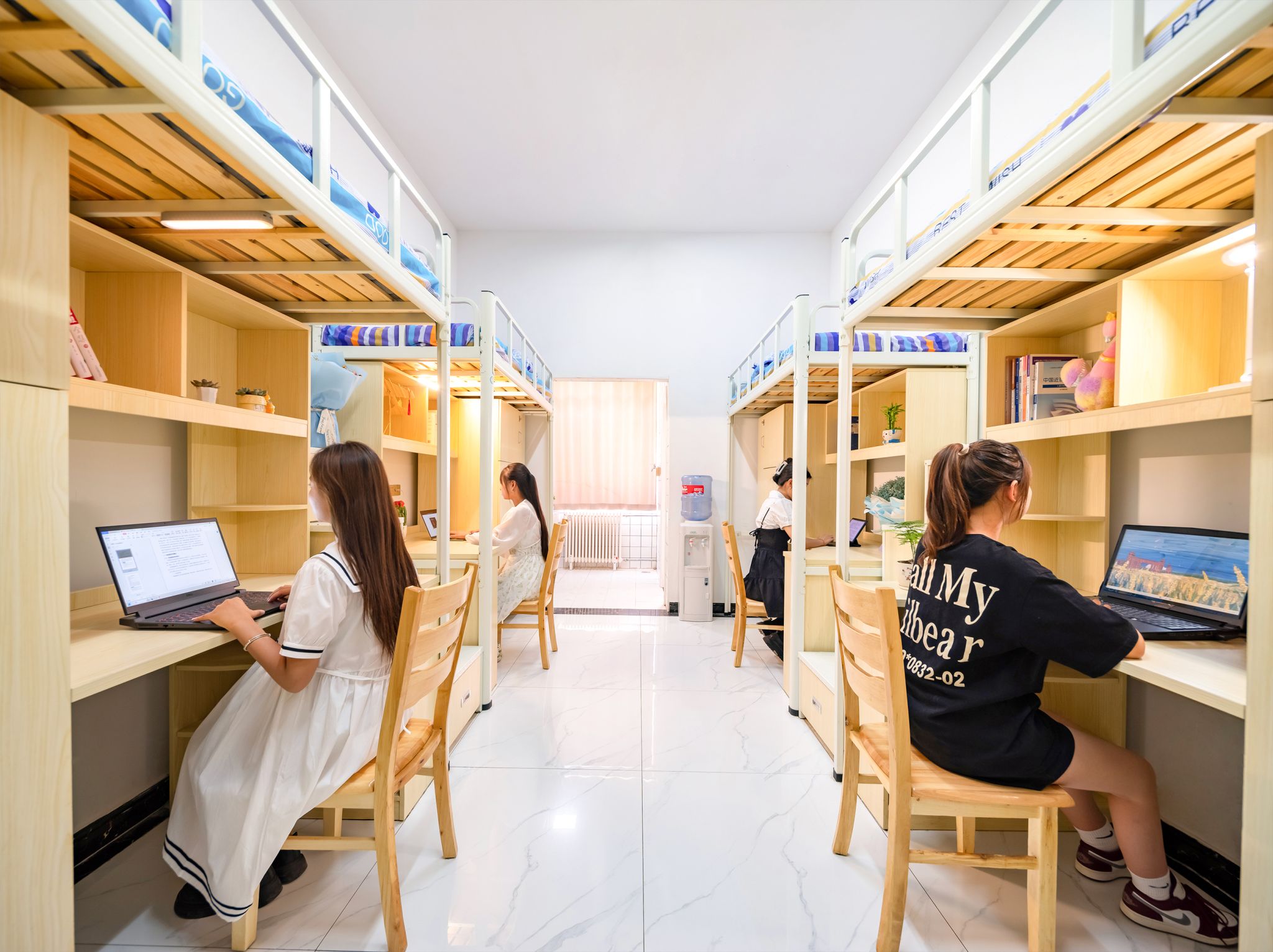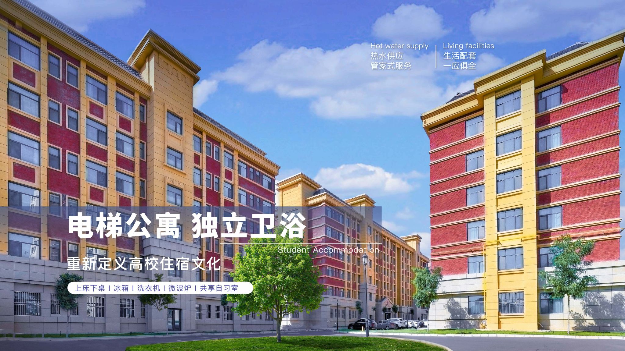 全省独家电梯公寓、独立卫浴、上床下桌,全天候WIFI覆盖、热水直达,配套洗衣机、吹风机、微波炉、售货机以及共享客厅、自习室,打开更高品质的大学生活方式。