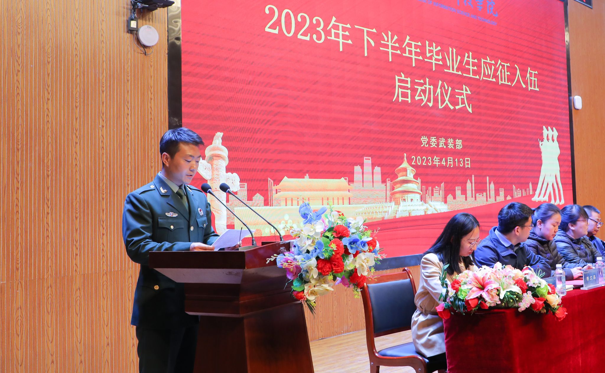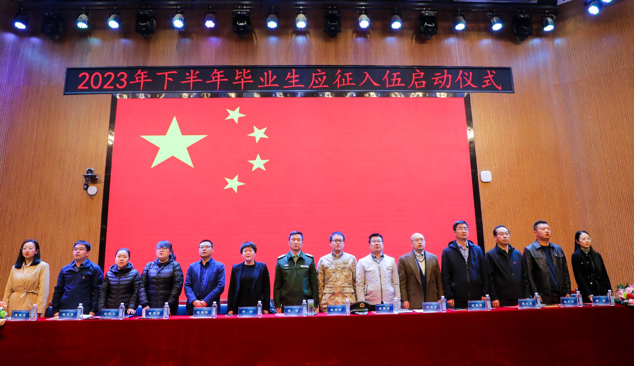 近日,beat365在线唯一官网2023年下半年毕业生征兵工作启动仪式在2号报告厅隆重举行。皋兰县人民武装部部长张强、学校校长助理师帅及党委武装部部长、学生处、团委、就业服务中心全体人员,各二级学院学生副院长、学生发展中心主任、团总支书记、全体辅导员,2023届毕业班班长、团支书,退役复学学生代表、意向入伍学生代表参加了启动仪式。