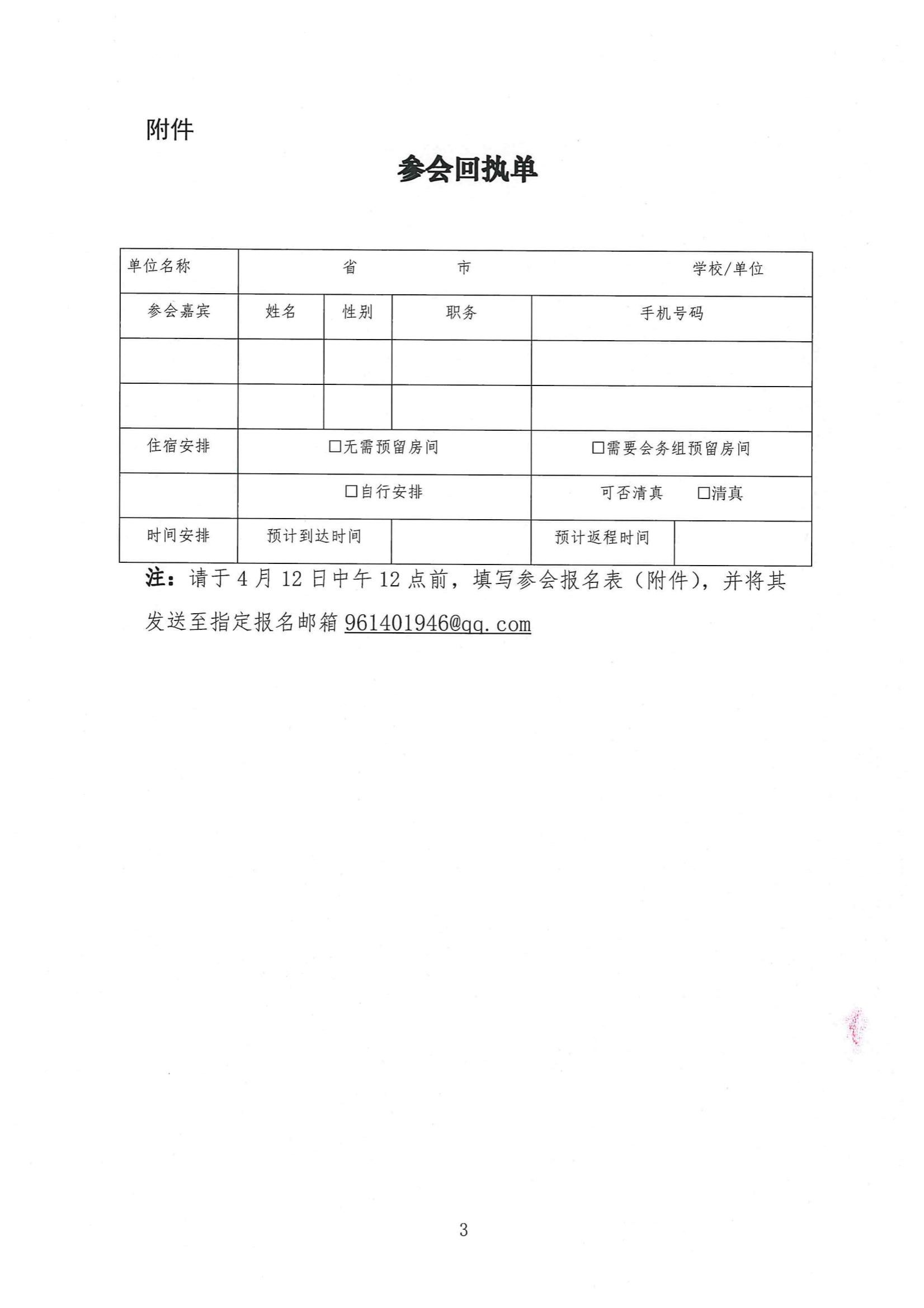 3.报名方式:请于4月12日中午12点前,填写参会报名表(附件),并将其发送至指定报名邮箱9614019460qq.com。