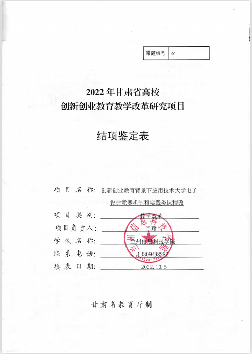 经项目负责人申请、组织专家验收、省教育厅审核,根据本次结题范围及研究成果认定,高等学校创新创业教育教学改革研究项目通过验收,同意结项。