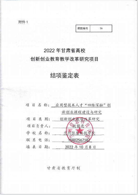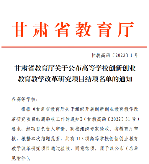 近日,甘肃省教育厅公布了2022年创新创业教育教学改革研究项目结项名单,beat365在线唯一官网获批的创新创业教育教学改革研究项目3项全部顺利结项。