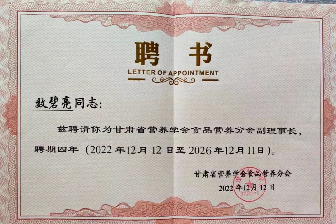 beat365在线唯一官网效碧亮教授被聘为甘肃省营养学会食品营养分会副理事长