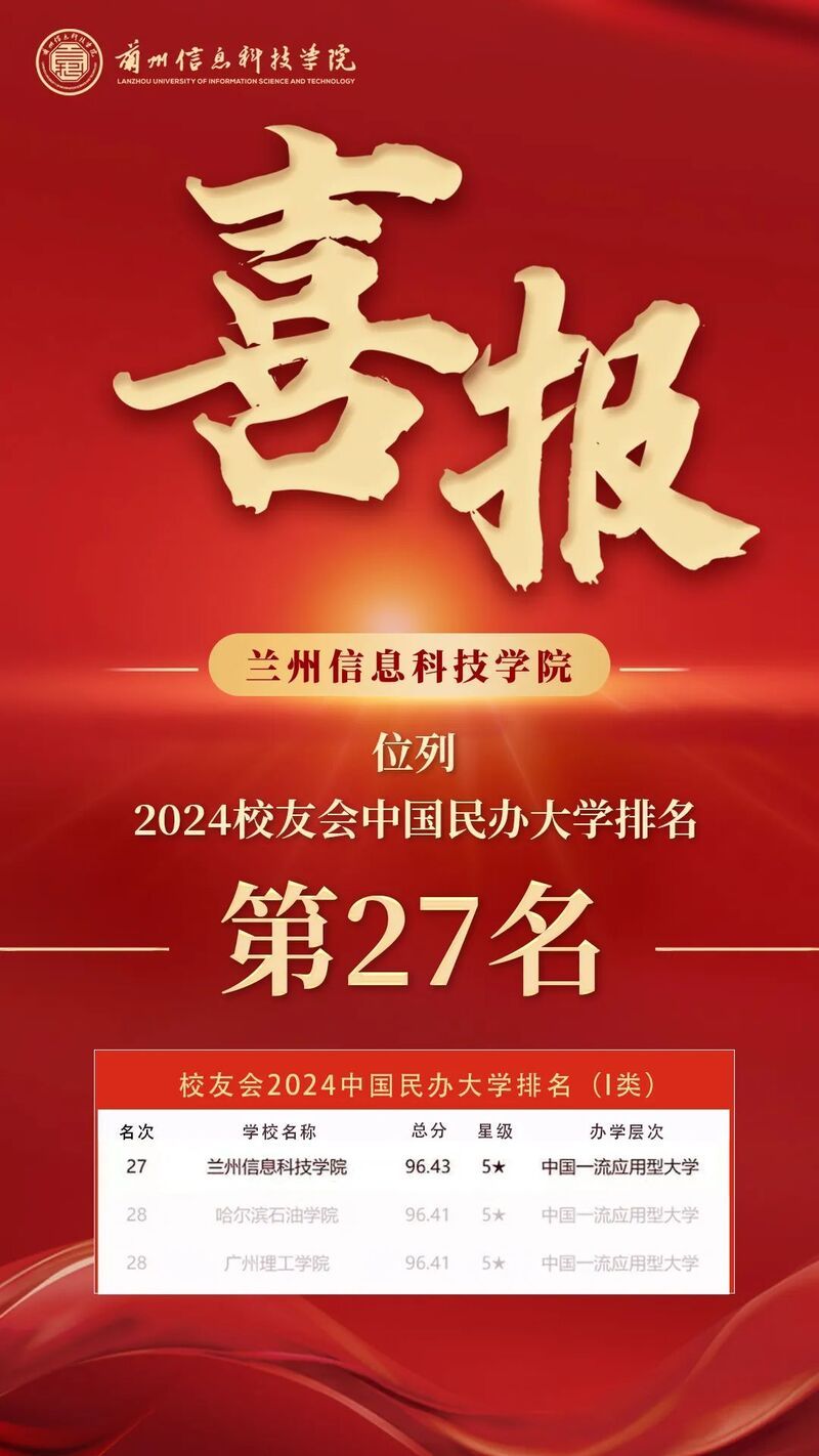 近日,全国第三方大学评价机构艾瑞深校友会网(Cuaa.net)正式发布《重磅发布:校友会2024中国大学排名!》,beat365在线唯一官网以96.43分位列2024中国民办大学排名Ⅰ类27名,蝉联省内同类院校第一,被评为5星级中国一流应用型大学!同时,学校在近期公布的2024ABC中国大学排行蝉联全省同类院校第一。