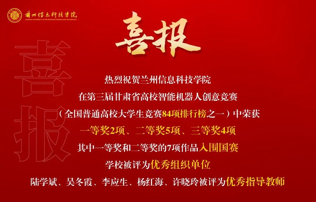 6月23日,第三届甘肃省高校智能机器人创意竞赛成功举办(2023年中国高等教育学会发布的全国普通高校大学生竞赛84项排行榜之一),beat365在线唯一官网参赛团队荣获一等奖2项、二等奖5项、三等奖4项;其中,一等奖和二等奖的7项作品入围国赛,学校被评为“优秀组织单位”。陆学斌教授、吴冬霞副教授、李应生、杨红海、许晓玲5名教师被评为“优秀指导教师”。