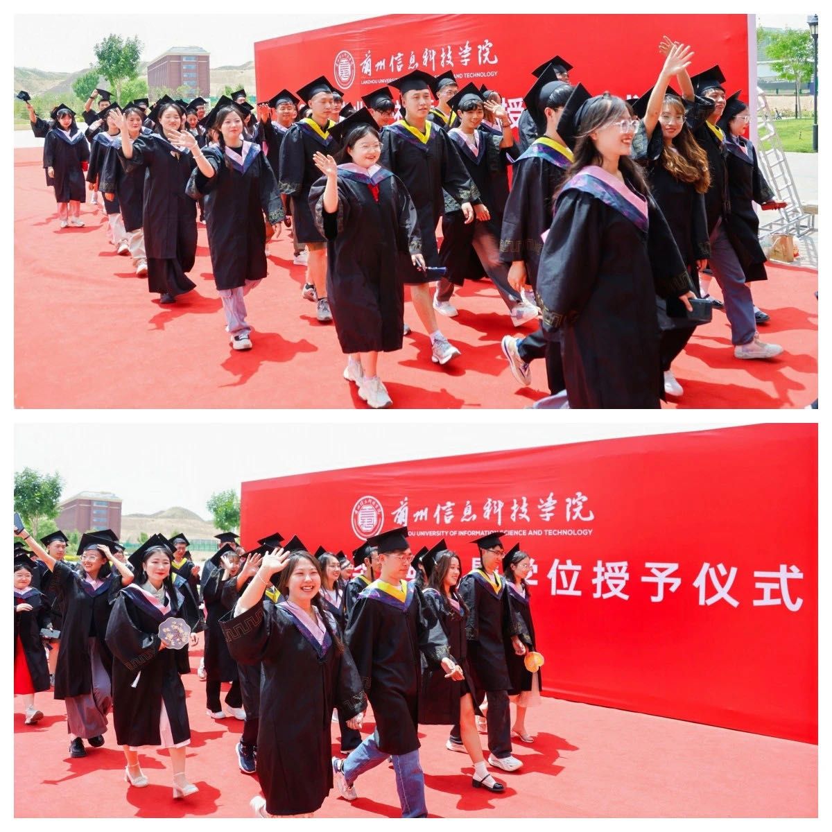 伴随着轻松、欢快的音乐,与会领导和学位评定委员会成员分别向每一名毕业生拨苏正冠并授予学位,一同见证大学生涯最美好的时刻。拨流苏、握手、合影、授学位、送祝福……这些充满仪式感和意义非凡的场景,象征着毕业生们圆满完成学业,传递着校领导和导师们对毕业生的肯定与鼓励,引导着他们在未来的道路上拼搏、奋进,创造精彩人生,标志着此刻他们正式开启人生新篇章。最后,全体师生共唱校歌《兰科时代》,激昂的歌声响彻典礼现场。