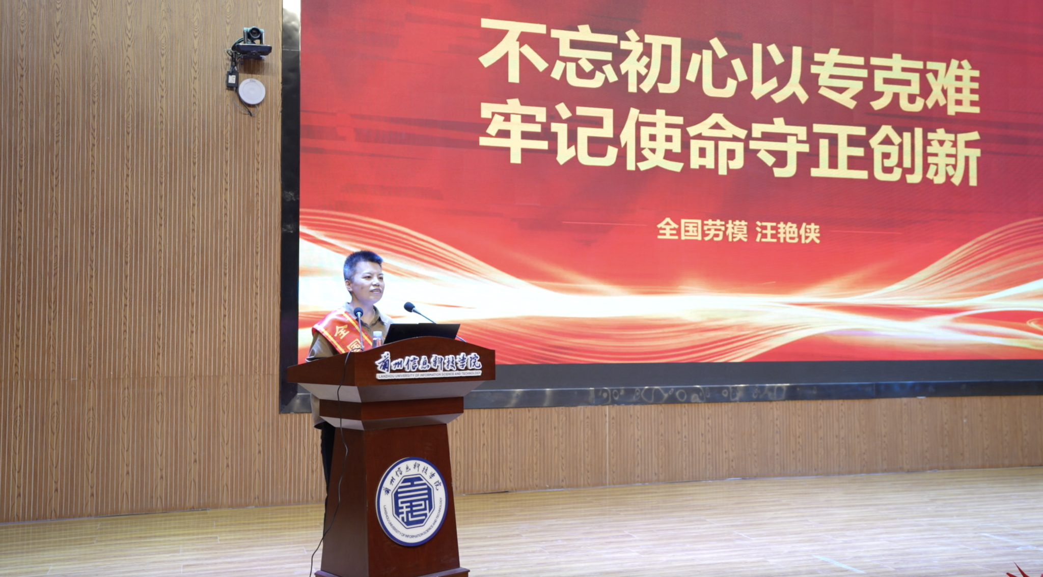 汪艳侠做《不忘初心以专克难·牢记使命守正创新》主题宣讲,范冬云做《爱我所爱无悔选择·筑梦平凡织就灿烂》主题宣讲。两位全国劳模讲述了自己从一线工人到技术骨干的成长历程,她们在丁腈橡胶装置、细纱挡车的平凡岗位上做出了不平凡的业绩,充分展示了当代产业工人的执着专注,更是用实际行动兑现了自己“做最好工人”的铮铮誓言,诠释了新时代劳动者的责任与担当。全场师生认真聆听两位“全国劳动模范”的感人故事,感受劳模们的奋斗历程和光辉成就,用经久不息的热烈掌声向两位劳模致敬。