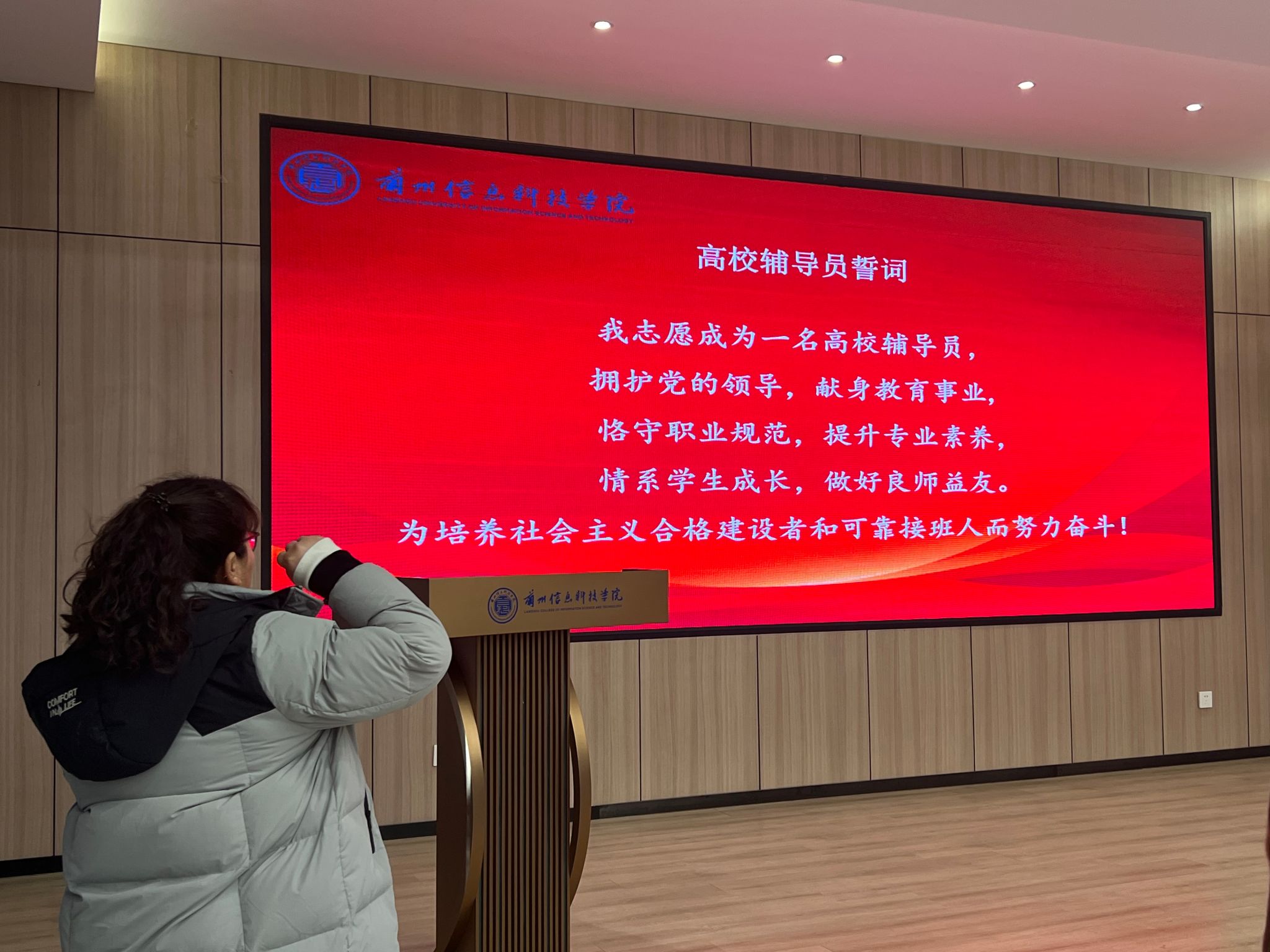 开班仪式开始,全体辅导员宣读高校辅导员誓词并签订《辅导员履职承诺书》。朱明敏勉励全体参训辅导员要把握历史机遇,担负时代使命,不断提升理论素养和职业能力,努力成为“经师”与“人师”的统一者。要提高政治站位,明确使命责任,做有担当的辅导员;提升工作能力,深入学生一线,做有温度的辅导员;提振育人活力,实现职业价值,做有情怀的辅导员。通过言传身教、知行合一,体现出爱国奉献的坚定信念、情系学生的高尚师德、甘为人梯的思想品德、育人育才的素质能力、严谨高效的工作作风、科学务实的工作态度,充分体现辅导员队伍在落实立德树人根本任务、推动高等教育高质量发展中的重要意义、重大责任和光荣使命,培养能够担负民族复兴大任的时代新人。