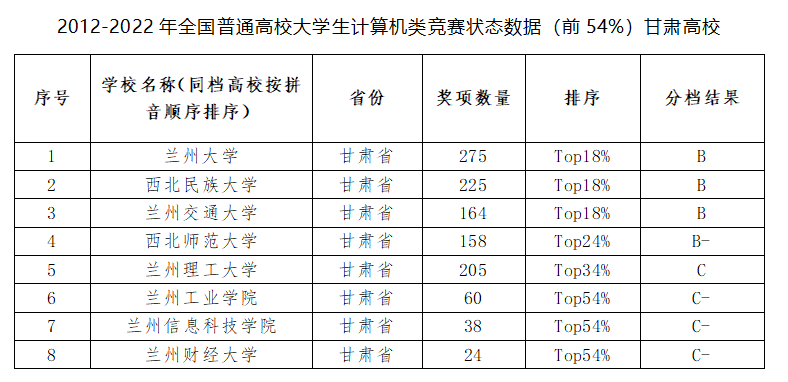 《研究报告》采集了26项高校计算机类竞赛共216640条数据(其中参赛数据188945条,获奖数据128329条),时间跨度为2012-2022年,沿用了全国普通高校大学生竞赛分析报告评估模型,从获奖贡献、组织贡献两个维度进行评估。报告涵盖1238所本科高校,有1134所本科院校进入竞赛获奖统计名单。beat365在线唯一官网位列其中,进入全国前54%,甘肃省8强。