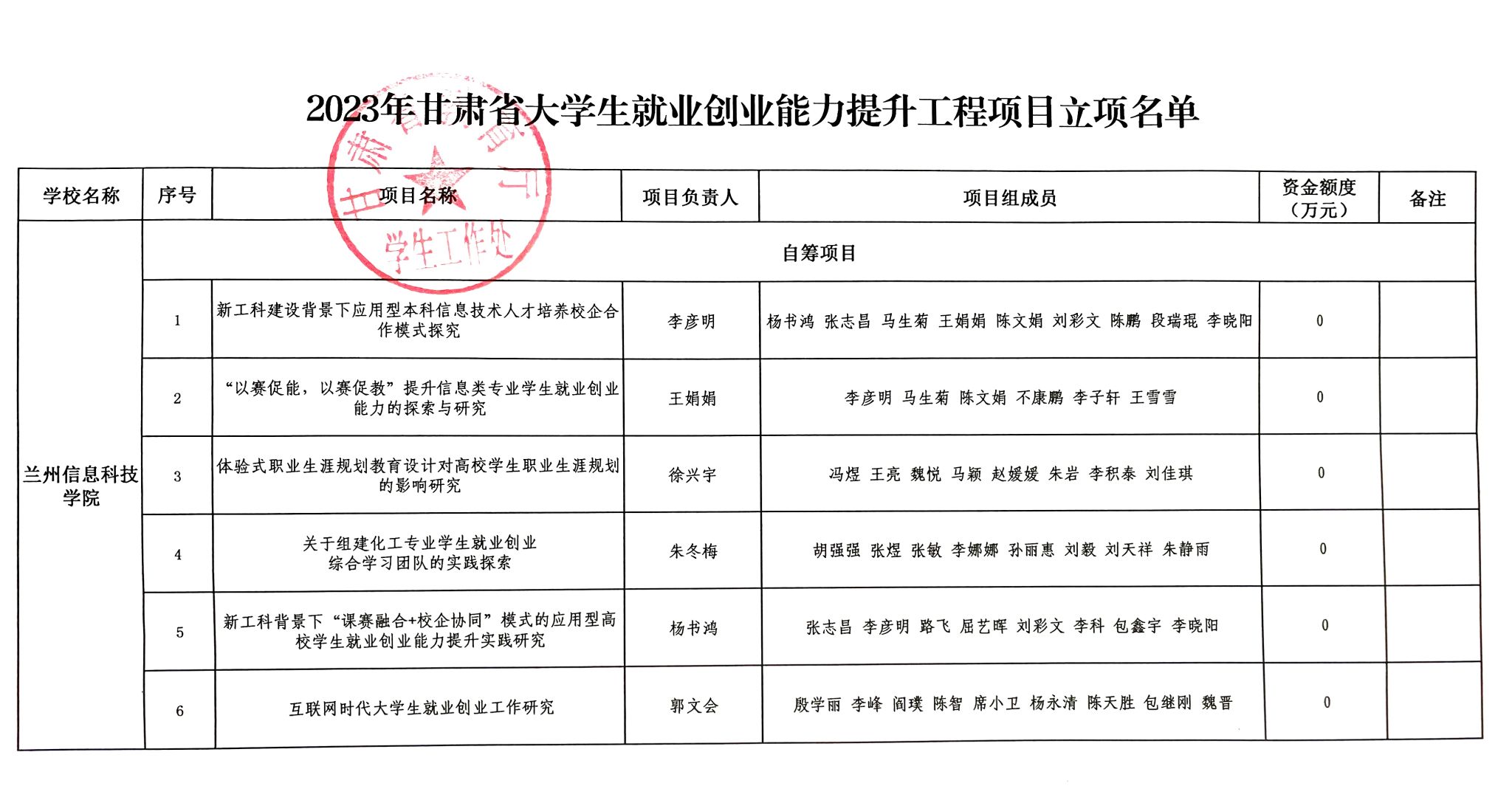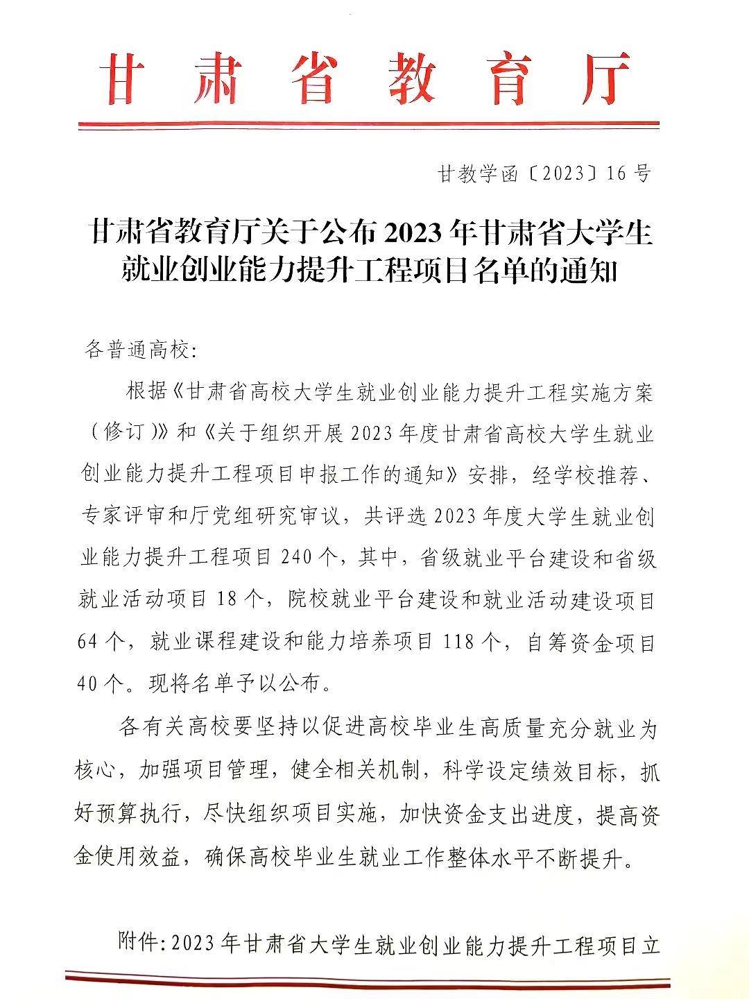 近日,甘肃省教育厅公布了《2023年甘肃省大学生就业创业能力提升工程项目名单》,beat365在线唯一官网《新工科建设背景下应用型本科信息技术人才培养校企合作模式探究》等6个自筹资金项目获批立项,学校就业创业工作取得新突破。