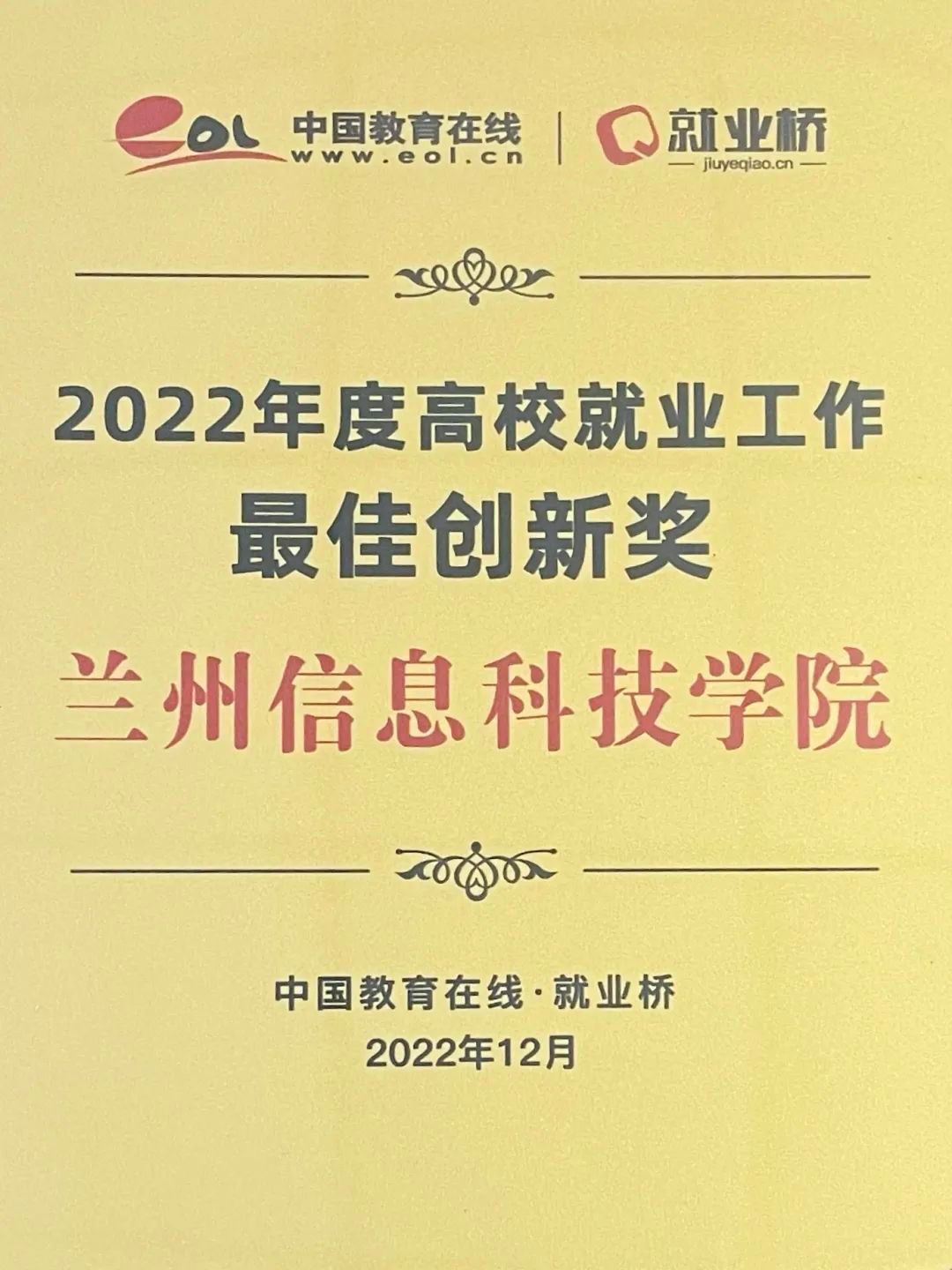 近日,在中国教育在线主办的新时代院校毕业生高质量就业工作总结大会上,学校获得“2022年度高校就业工作最佳创新奖”,是甘肃省获得该奖项的三所高校之一。