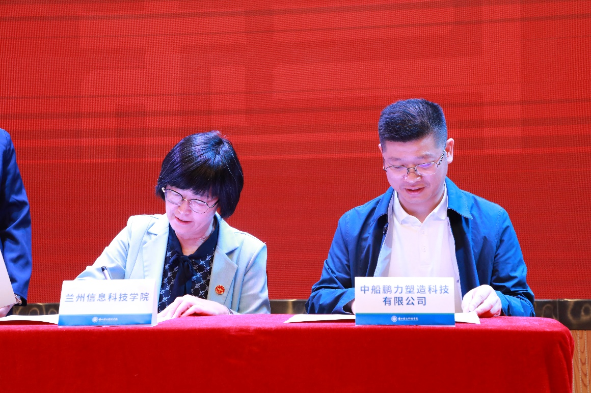 最后在全场热烈的掌声中,校企双方代表签订校企合作协议,共同为中船鹏力新材料智能成型产业学院揭牌。