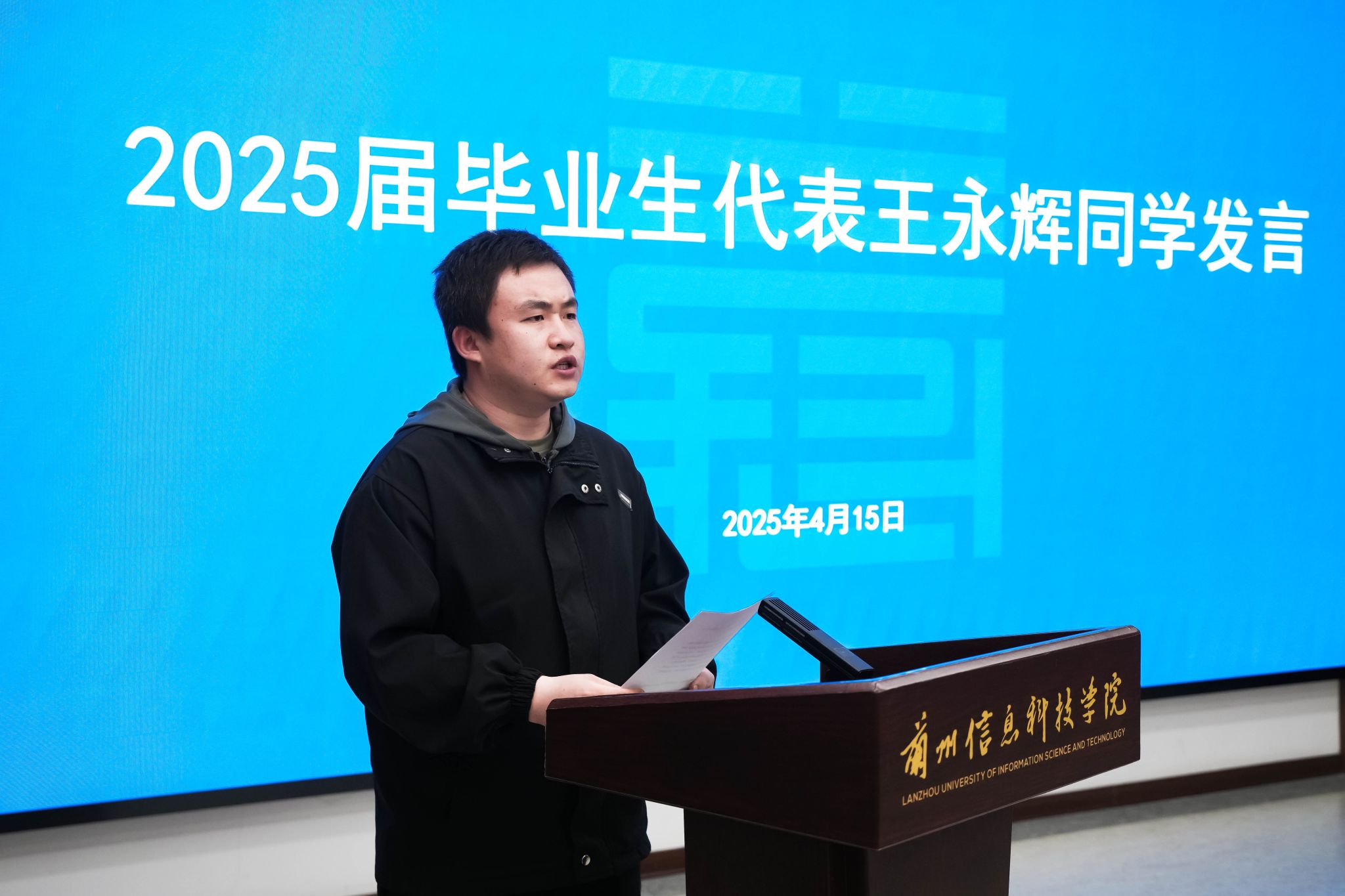 2025届毕业生代表王永辉同学在发言中表达了对学校和企业的感谢,并承诺将秉承求是、砺志、笃行的校训精神,脚踏实地、勇于担当,在岗位上展现兰科学子的风采。