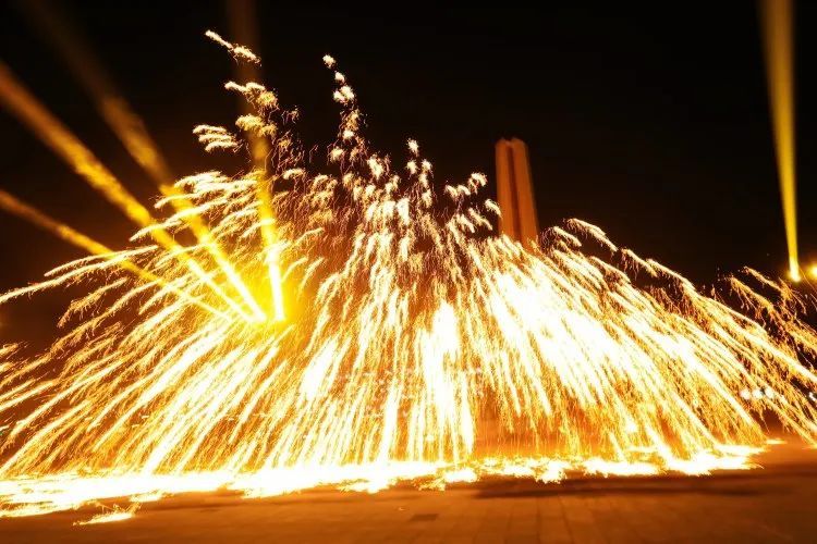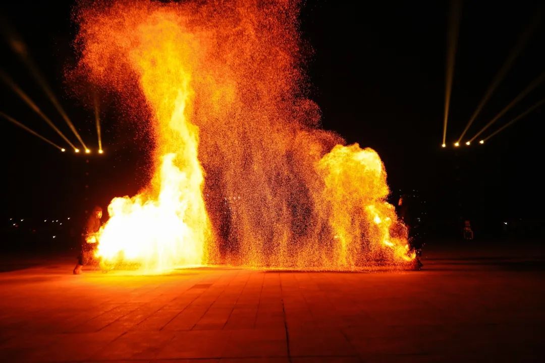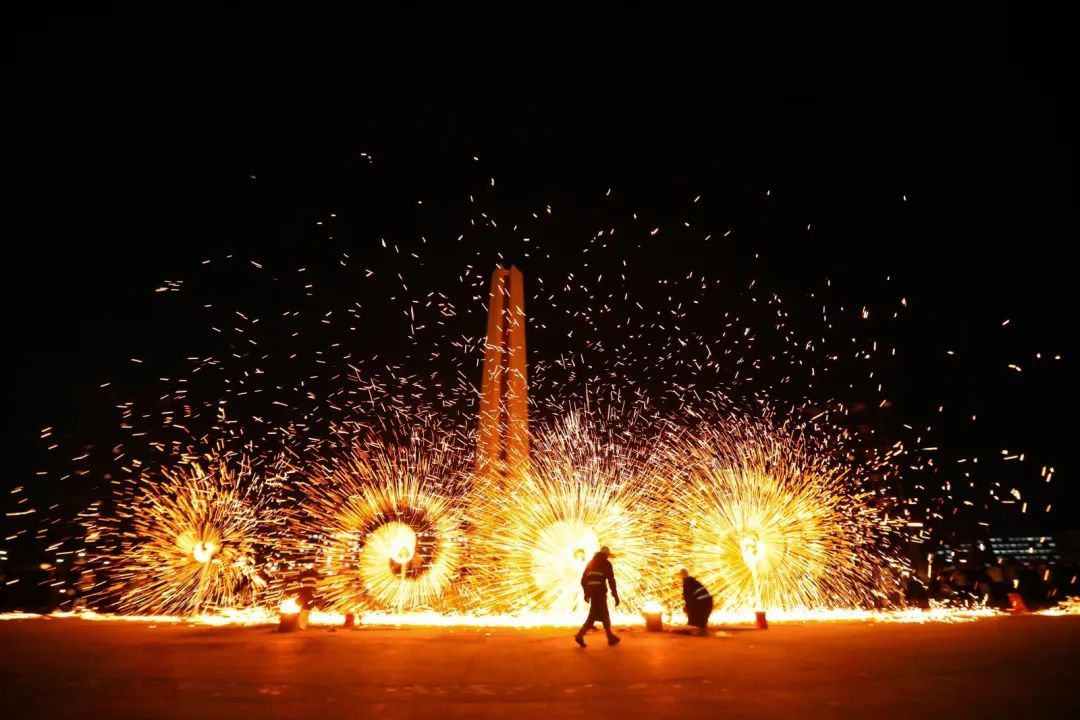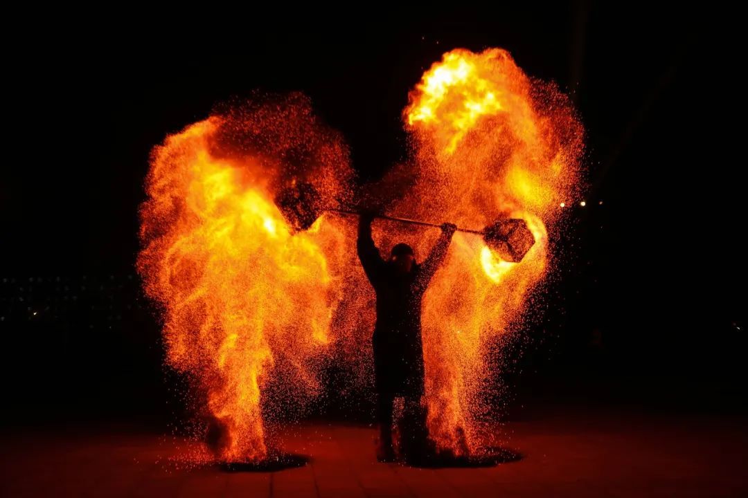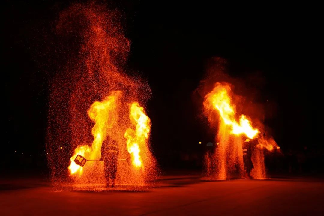 表演者们巧妙地用道具与铁水配合,将铁水快速挥洒到空中,火花好似纷飞的银屑,在漆黑的夜幕中闪耀着光芒,轮上的火焰熊熊燃烧,在夜色中勾勒出灵动的轨迹,是力量与速度的完美融合,光轨炸开仿佛是闪电留下的独特纹身。